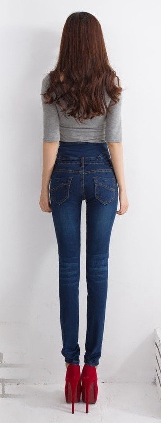 Questi jeans da donna a vita alta mettono perfettamente in risalto le linee femminili.