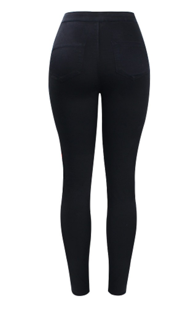 Jeans da donna originali con vita alta e fiori rossi sui lati delle cosce.