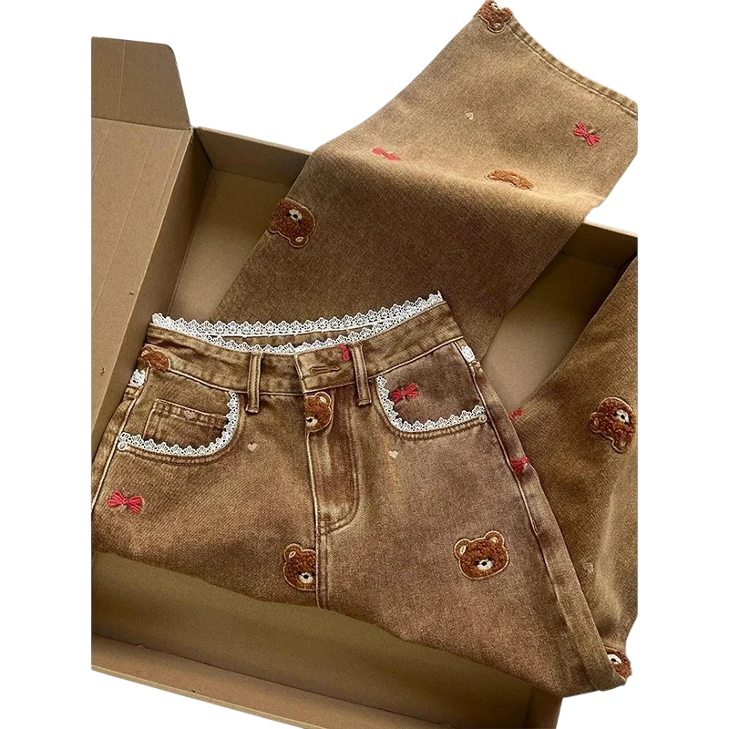 Pagina iniziale Pagina iniziale Abbigliamento e accessori Abbigliamento donna Jeans da donna Jeans da donna marroni con stampa di orsetti e tasche in poliestere pantaloni casual moderni stile trendy per l'uso quotidiano