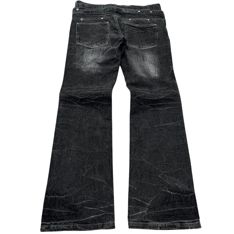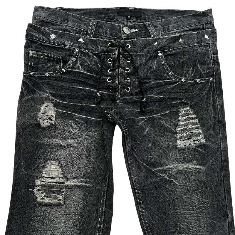 Jeans gotici unisex con gamba ampia, lacci, borchie e dettagli strappati, ideali per uno stile street alternativo e audace. Descrizione completa