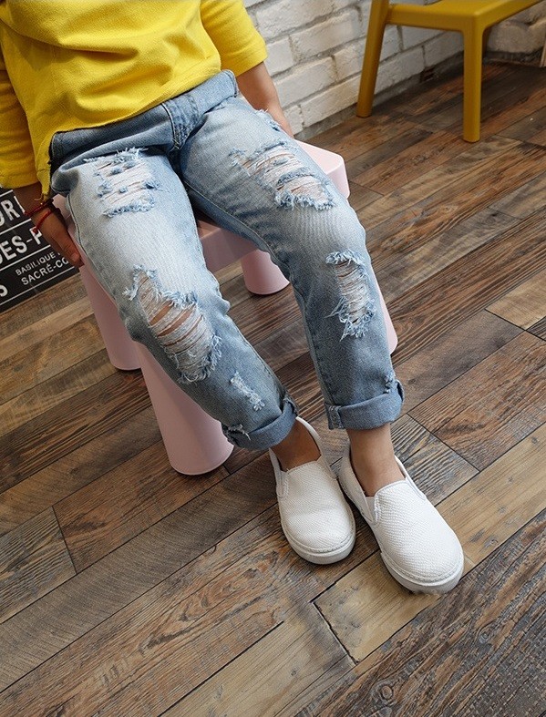 Bellissimi jeans strappati da bambino in colore blu chiaro.