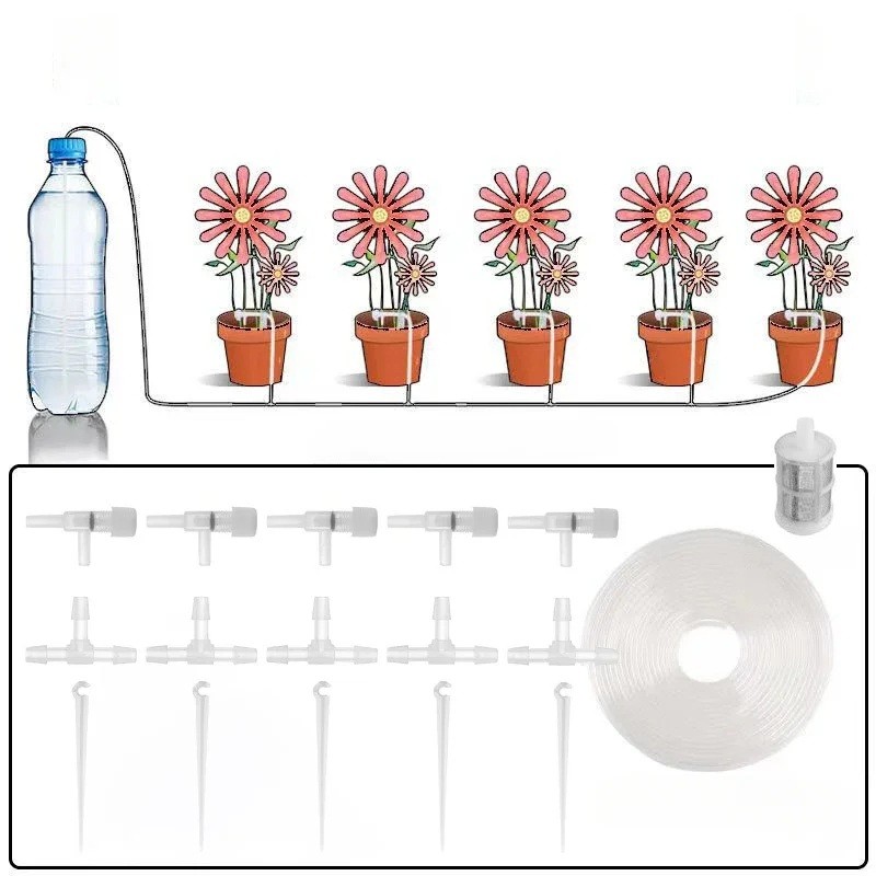 Kit per irrigazione automatica a goccia fino a 5 vasi senza rubinetto. Tubo di 5 m, gocce, filtro e collegamento a bottiglia PET – ideale per le vacanze. Descrizione completa