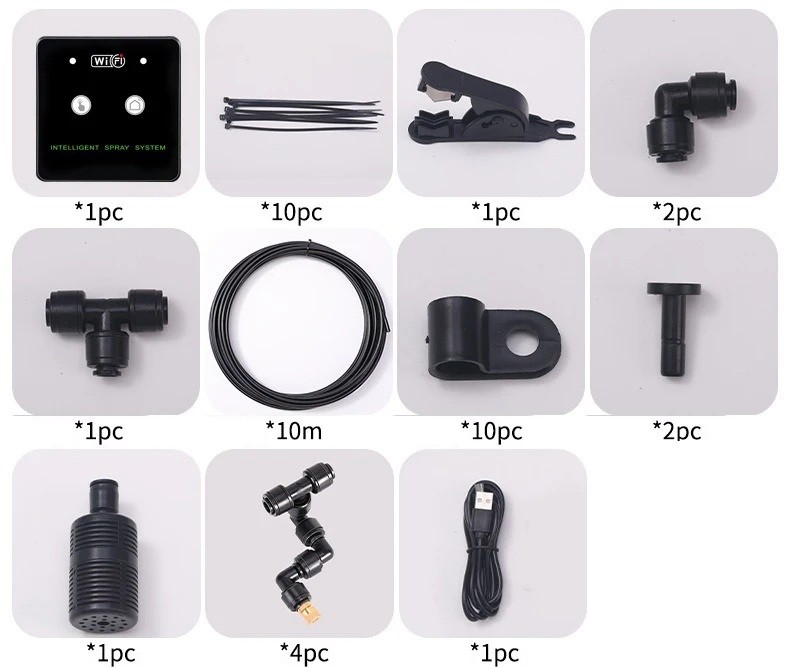 1× unità di controllo WiFi, 1× cavo USB, 1× tubo da 10 m, 4× ugello nebulizzatore, 1× connettore T, 2× gomito, 2× connettore ugello, 1× filtro, 10× fascetta di serraggio, 10× supporto per tubo, 2× adattatore, 1× manuale, 1× forbici