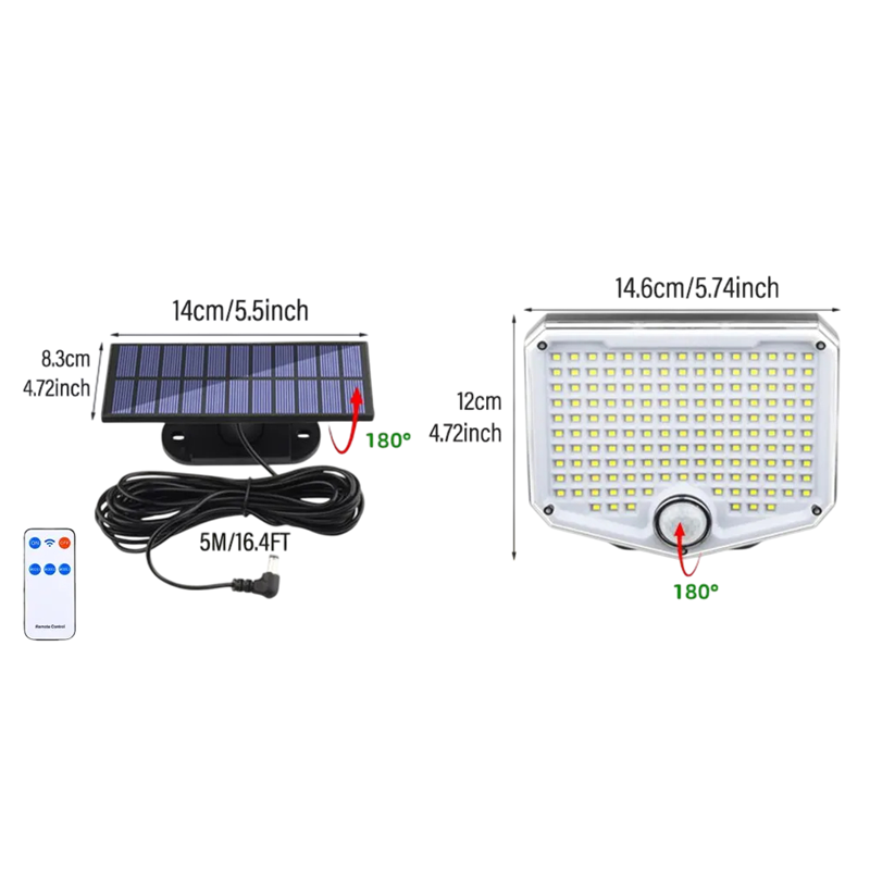 Questa lampada solare da parete con 153 LED è la soluzione ideale per illuminare gli spazi esterni senza la necessità di collegamenti elettrici. Offre una combinazione di alta luminosità, funzioni intelligenti e costruzione resistente, adatta a qualsiasi condizione atmosferica. Grazie al sensore di movimento, la luce si attiva solo quando è realmente necessaria, contribuendo a risparmiare energia e aumentando la sicurezza della tua casa. Tre modalità di illuminazione regolabili consentono un'impostazione personalizzata in base alla situazione o al momento della giornata. Il pratico telecomando garantisce un'operazione comoda senza la necessità di toccare direttamente il dispositivo.