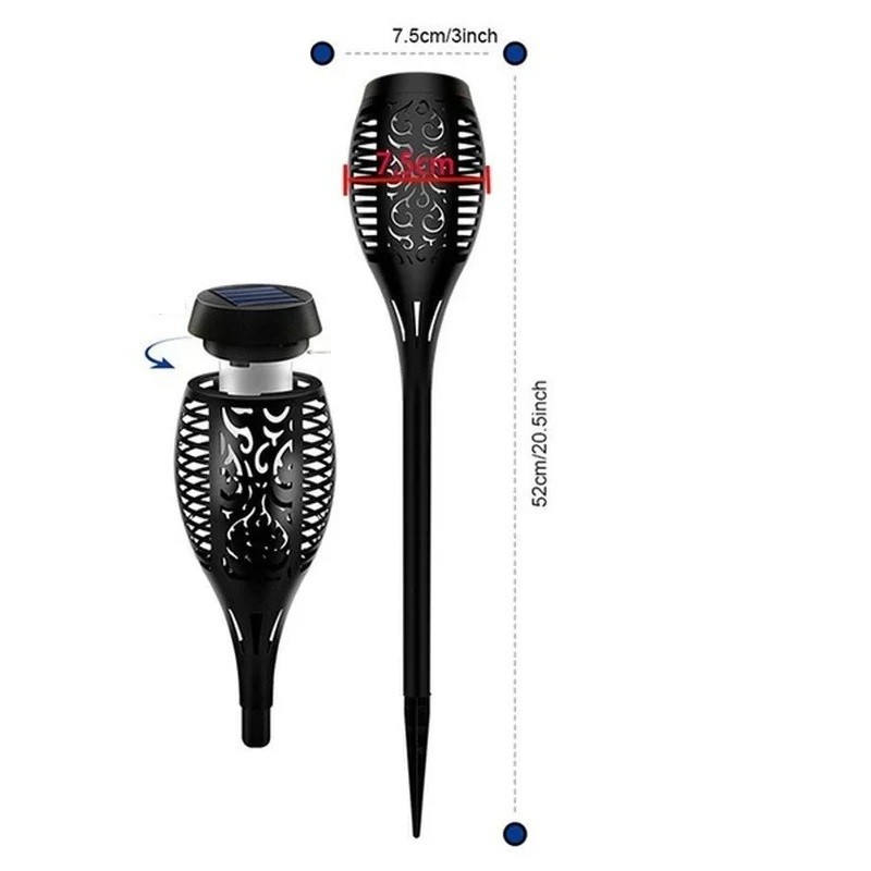 Lampada LED solare con effetto fiamma 52 cm, impermeabile IP65 per giardini e vialetti esterni Questa lampada LED solare con effetto fiamma è un ottimo modo per decorare il tuo giardino, vialetto, cortile o terrazza. Grazie all'effetto fiamma realistico, crea un'atmosfera autentica che simula fiamme vere, ma senza alcun rischio. La lampada è dotata di un pannello solare che garantisce un'illuminazione ecologica e a risparmio energetico per il tuo giardino. La lampada ha un'altezza di 52 cm, rendendola ideale per essere posizionata in aiuole, intorno a piscine, su vialetti o terrazze. Grazie al pannello solare di alta qualità (5,5V / 1,2W), si ricarica durante il giorno e si accende automaticamente al crepuscolo. Quando sorge il sole, si spegne automaticamente, risparmiando energia e prolungando la vita della batteria. L'effetto fiamma è creato tramite LED che, all'accensione, imitano il movimento delle fiamme, conferendo al tuo spazio esterno un aspetto magico. La lampada è progettata per un'installazione facile, senza bisogno di cavi, il che significa che puoi posizionarla dove ne hai bisogno, sia su vialetti, giardini o intorno a spazi esterni.
