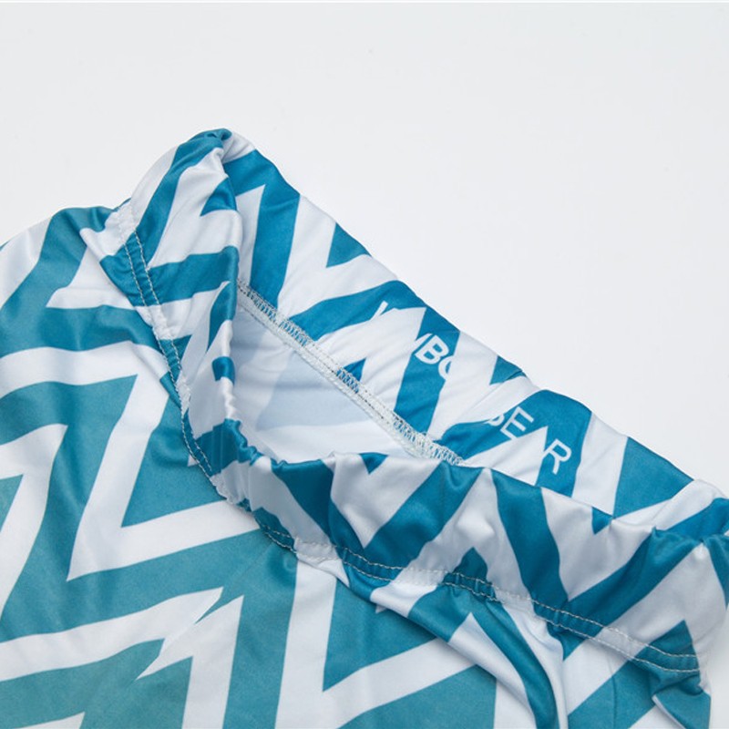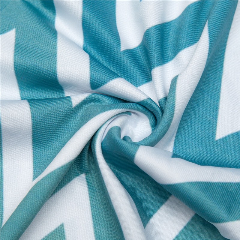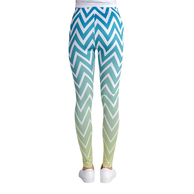 Krásné legíny s cik cak vzorem, které jsou modré a směrem dolů světlají až k světle zelené.