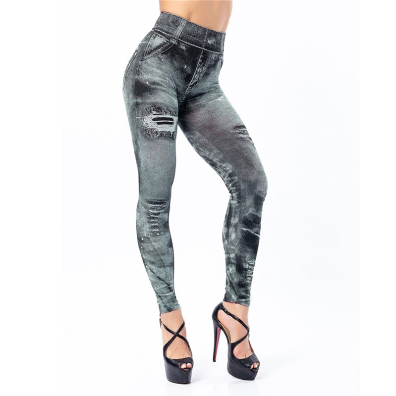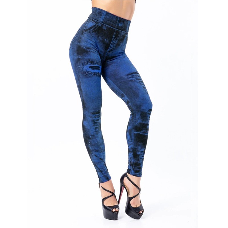 Leggings alla moda con stampa che imita i jeans e effetto push-up. L'alta vita garantisce comfort e modellatura della figura durante l'uso quotidiano. Descrizione completa