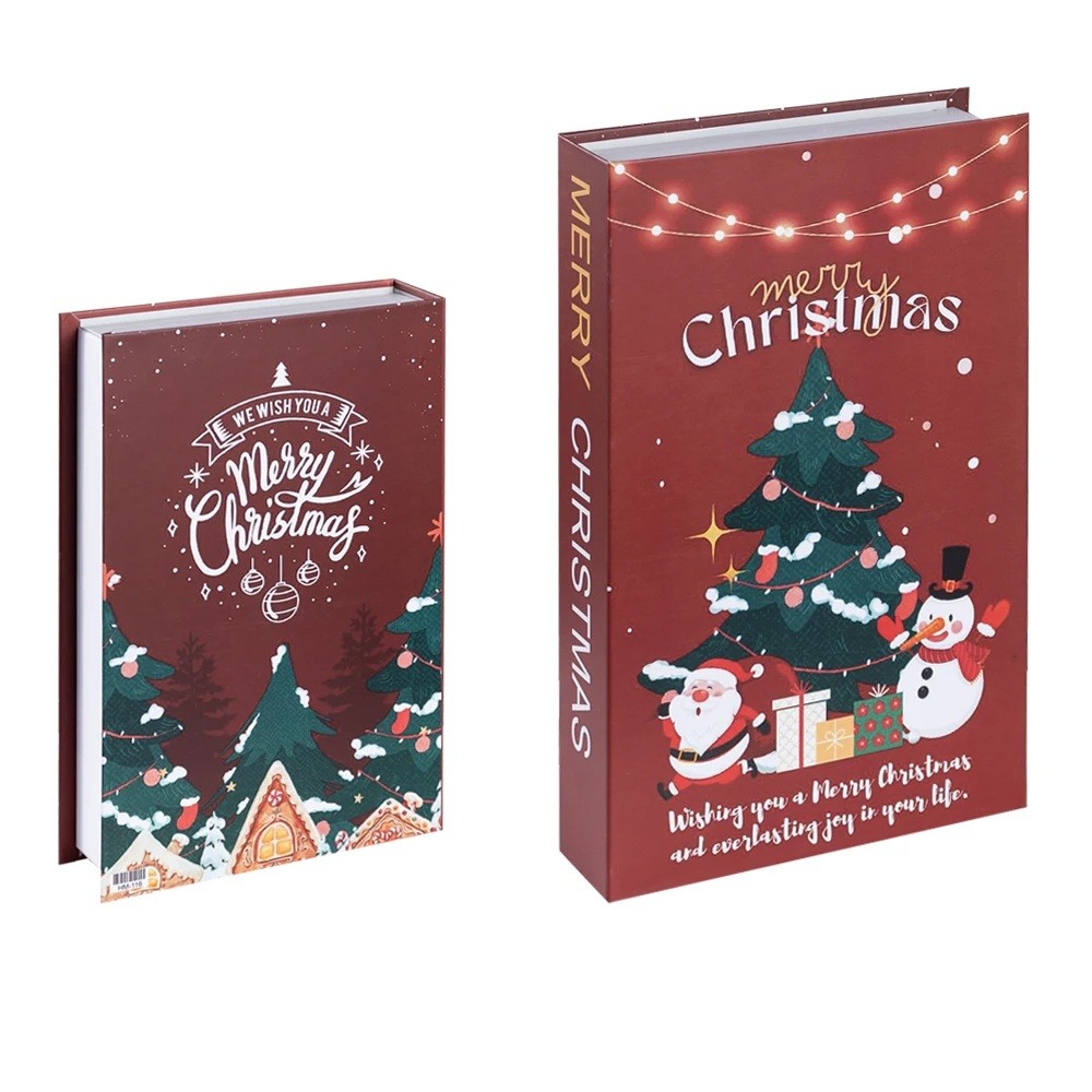 La decorazione elegante a forma di libro è un ottimo complemento per creare un'atmosfera festiva accogliente all'interno. Libro decorativo falso è progettato per assomigliare realisticamente a un vero libro, rendendolo perfetto per la biblioteca, lo scaffale o il comò. Il design natalizio elegante con motivo dell'albero di Natale, Babbo Natale e pupazzo di neve evoca immediatamente un'atmosfera invernale.