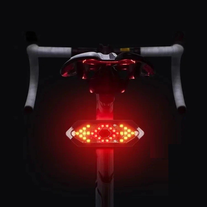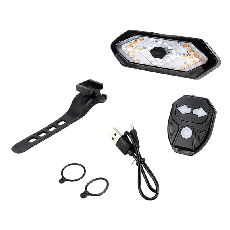 Luce LED posteriore controllata a distanza con indicatori di direzione, 5 modalità di illuminazione, ricarica USB, batteria da 900mAh, facile installazione sul reggisella della bicicletta. Descrizione completa