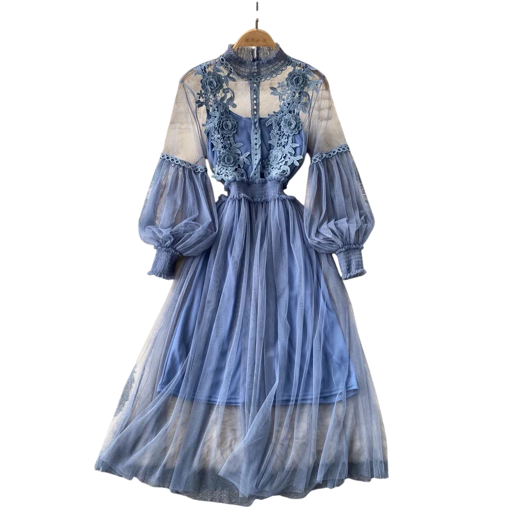 Eleganti abiti blu a due strati con maniche voluminose, pizzo floreale e strato inferiore delicato per eventi sociali di stile. Descrizione completa