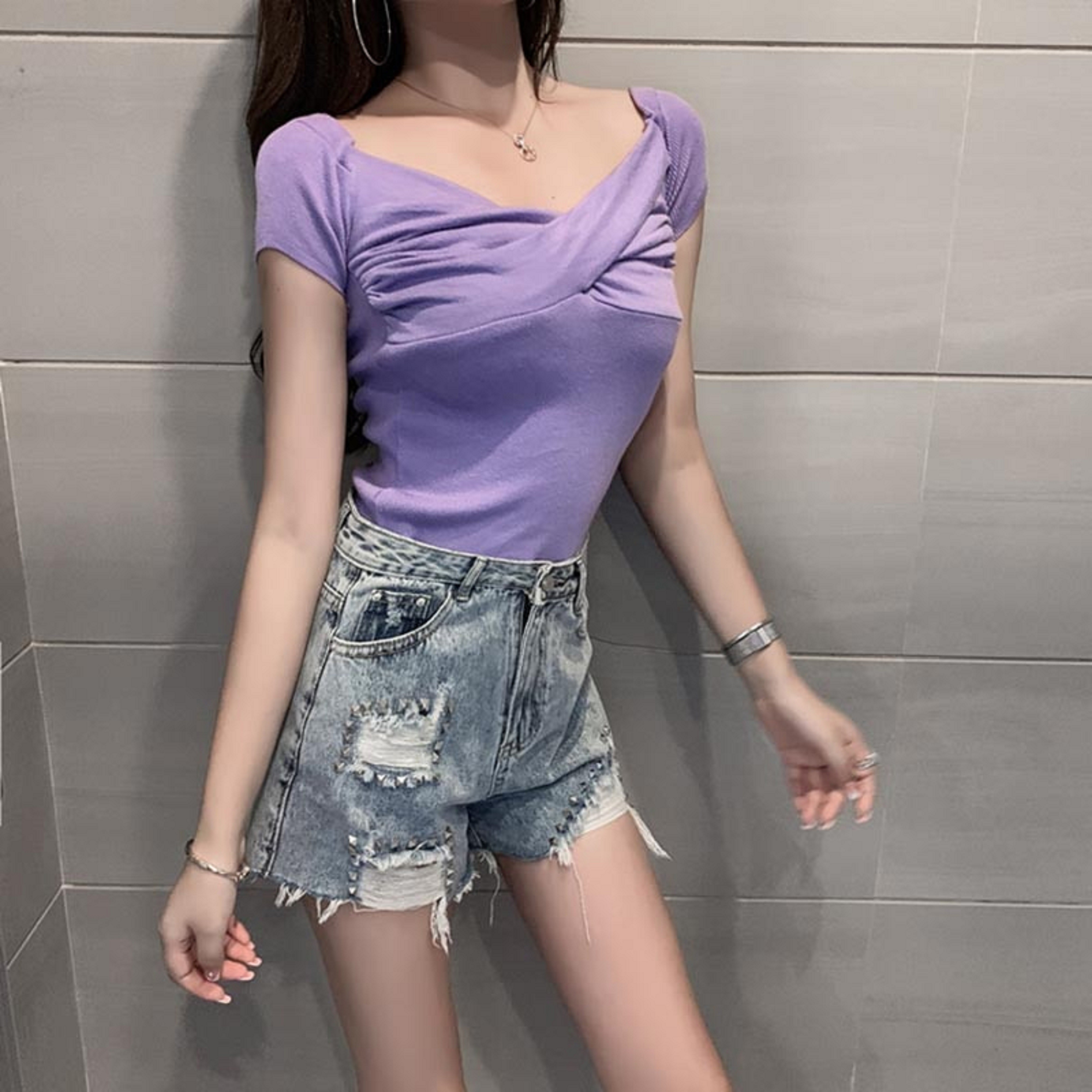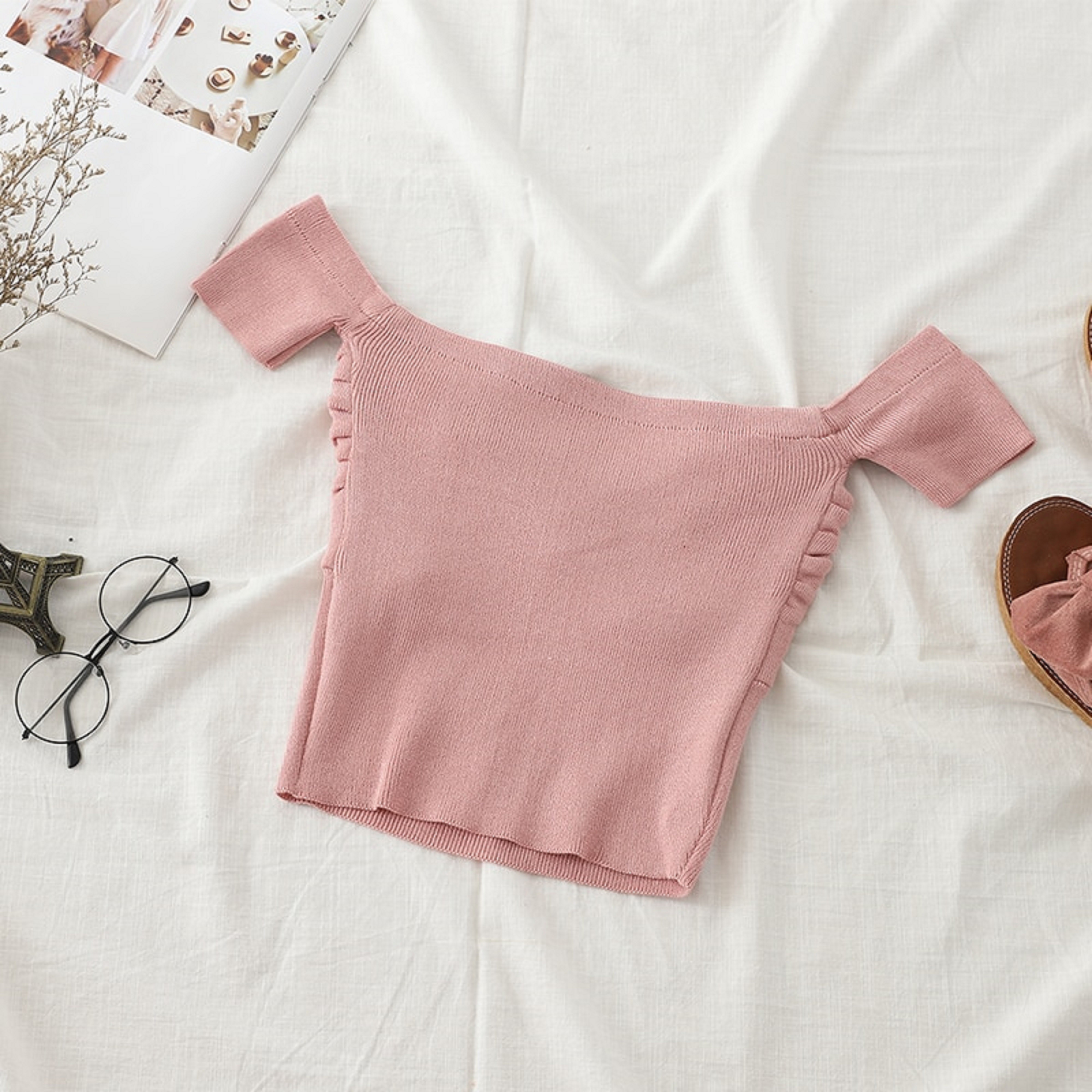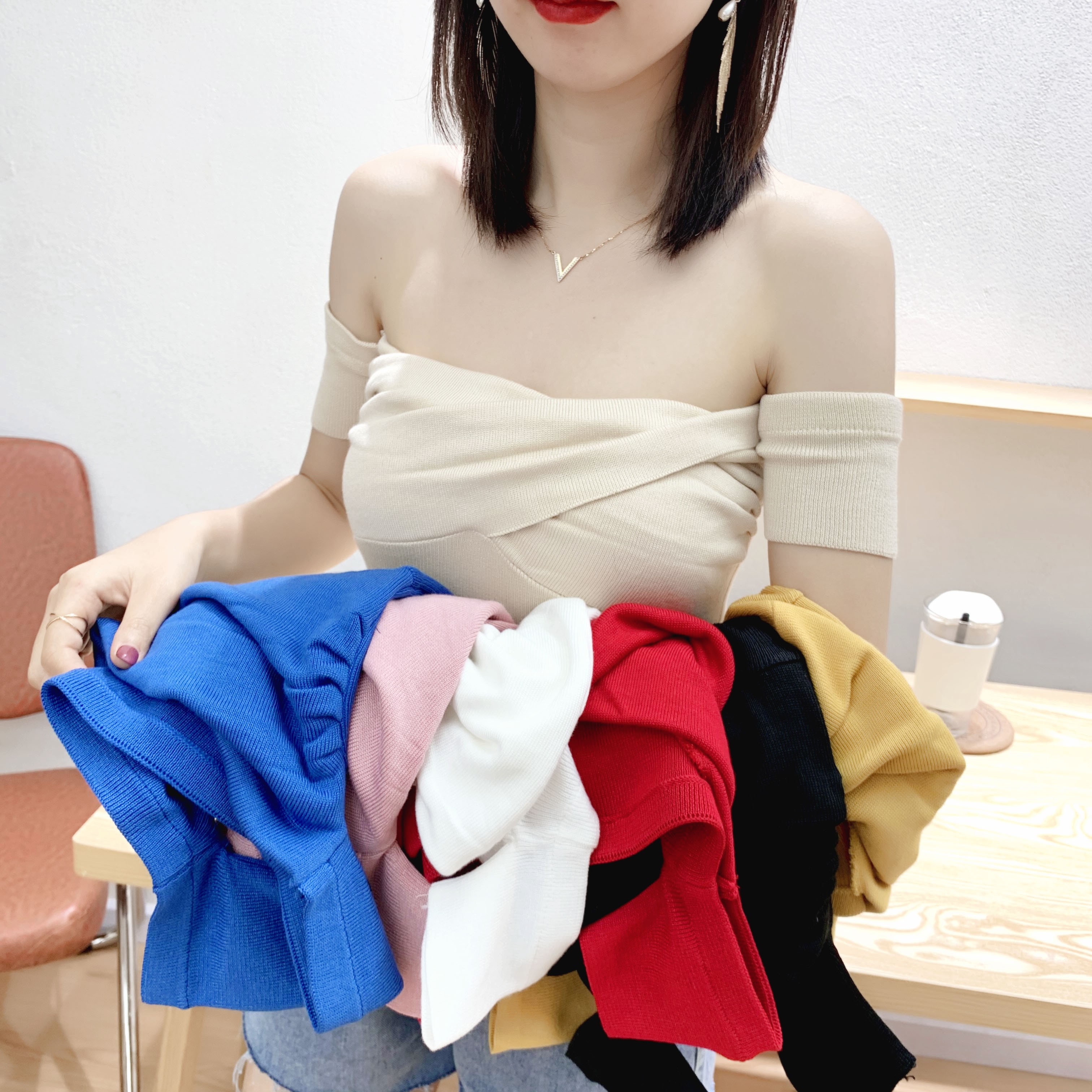 Maglietta a maglia da donna con spalle scoperte