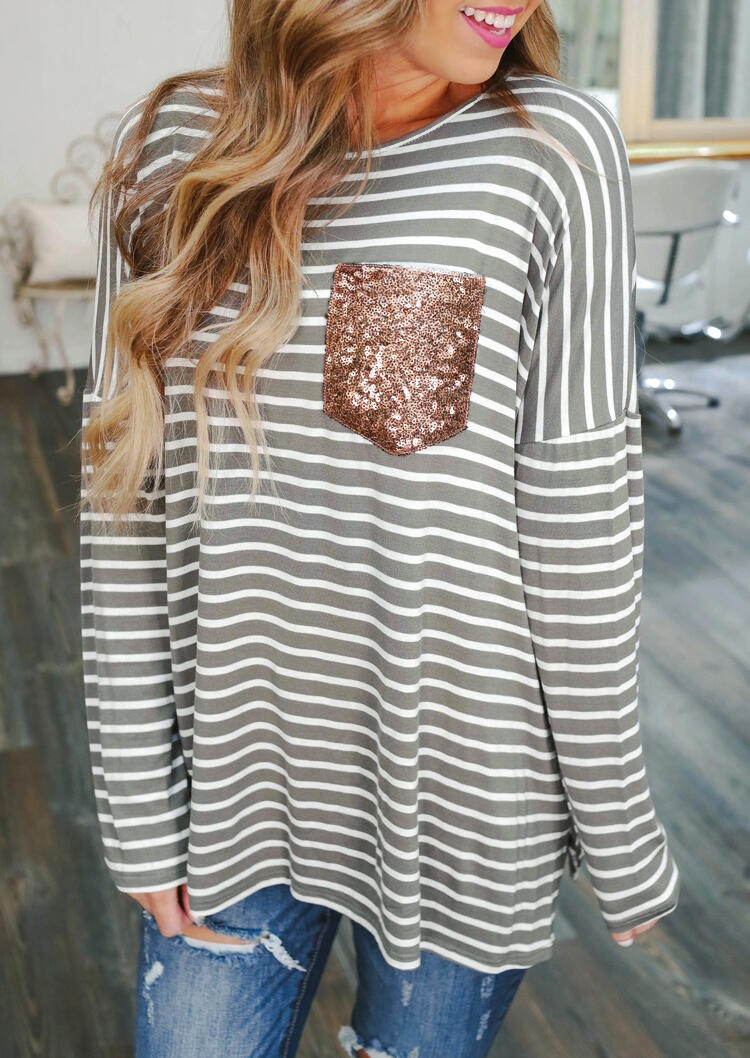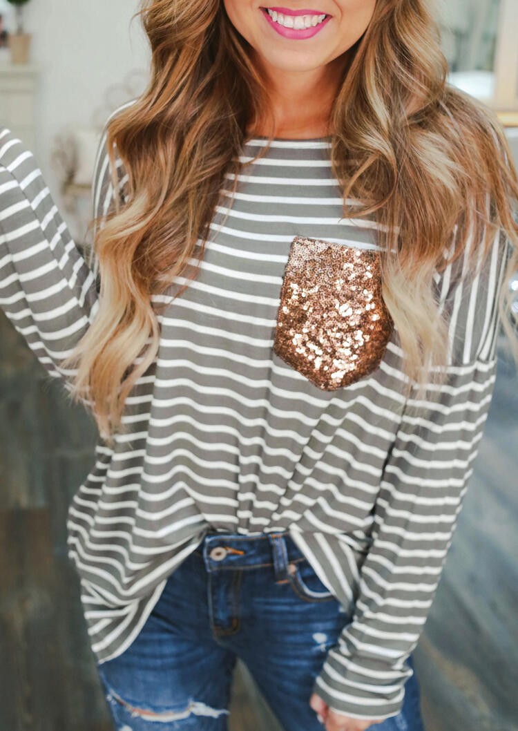 Maglietta a righe da donna con tasca di paillettes