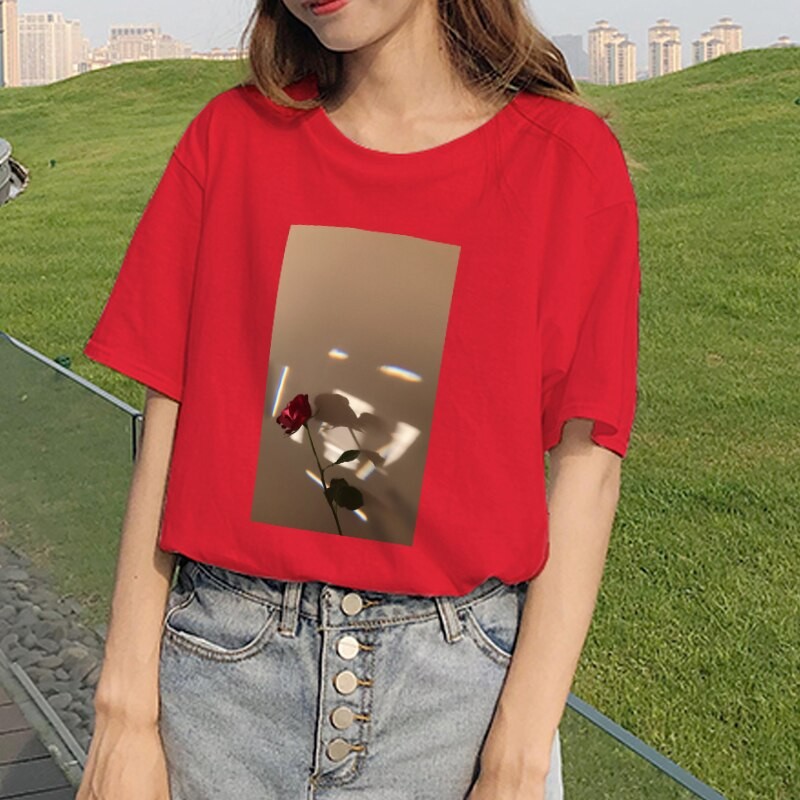 Maglietta da donna con stampa di rosa
