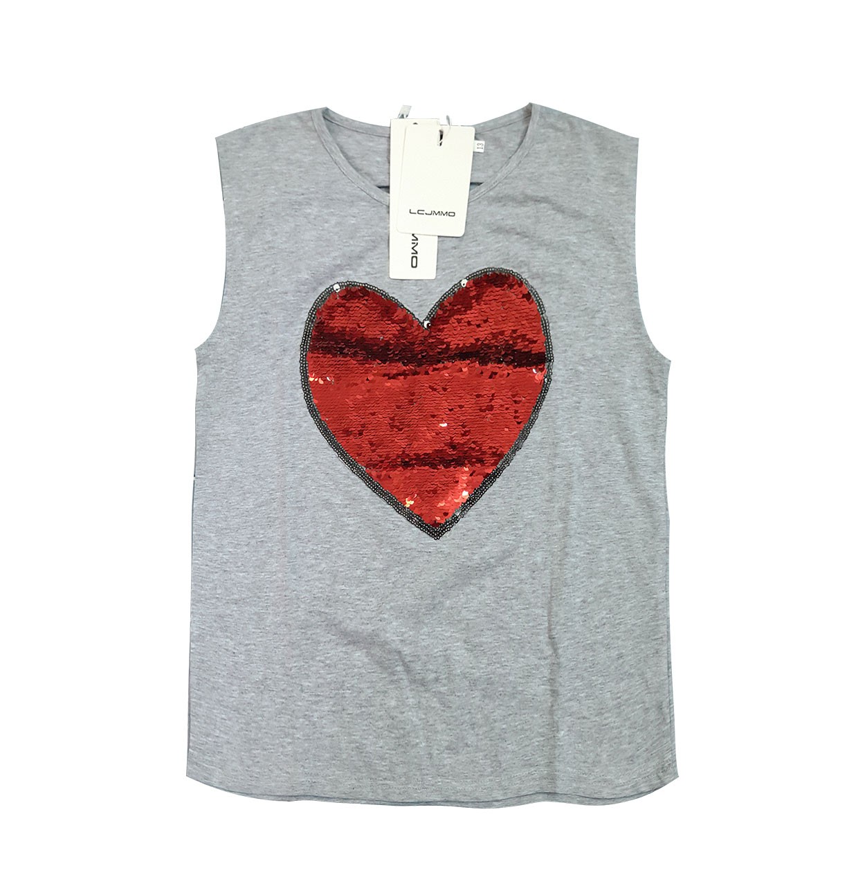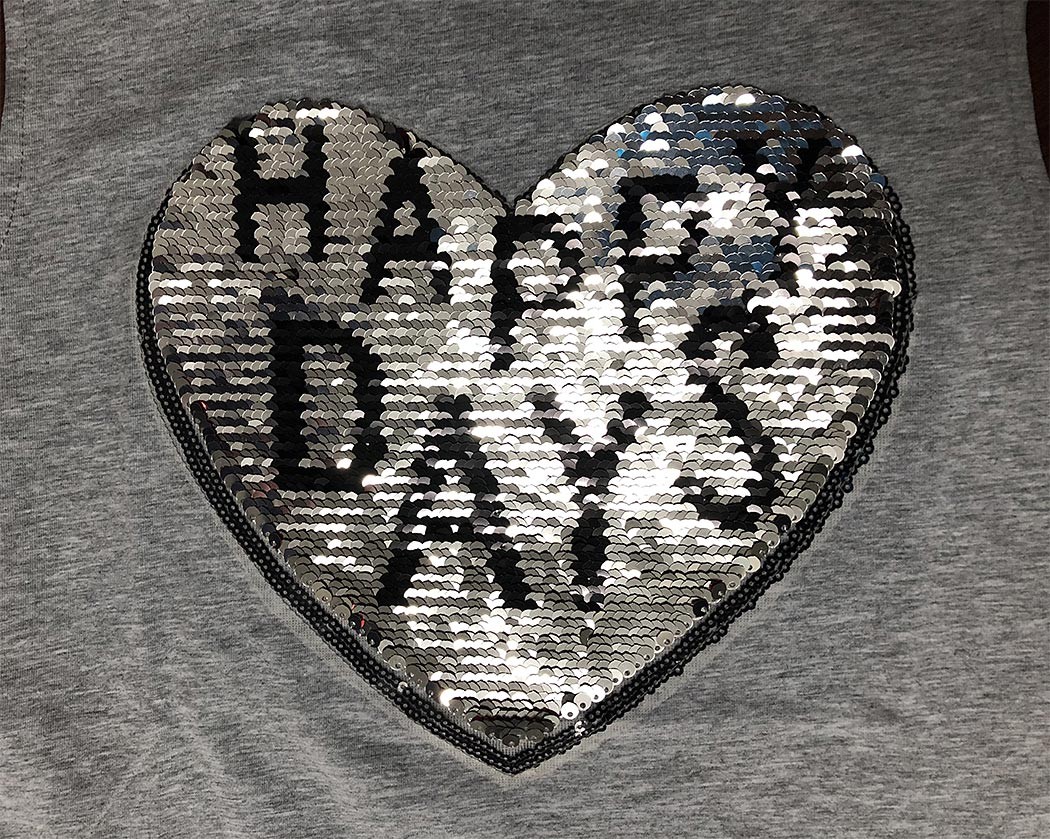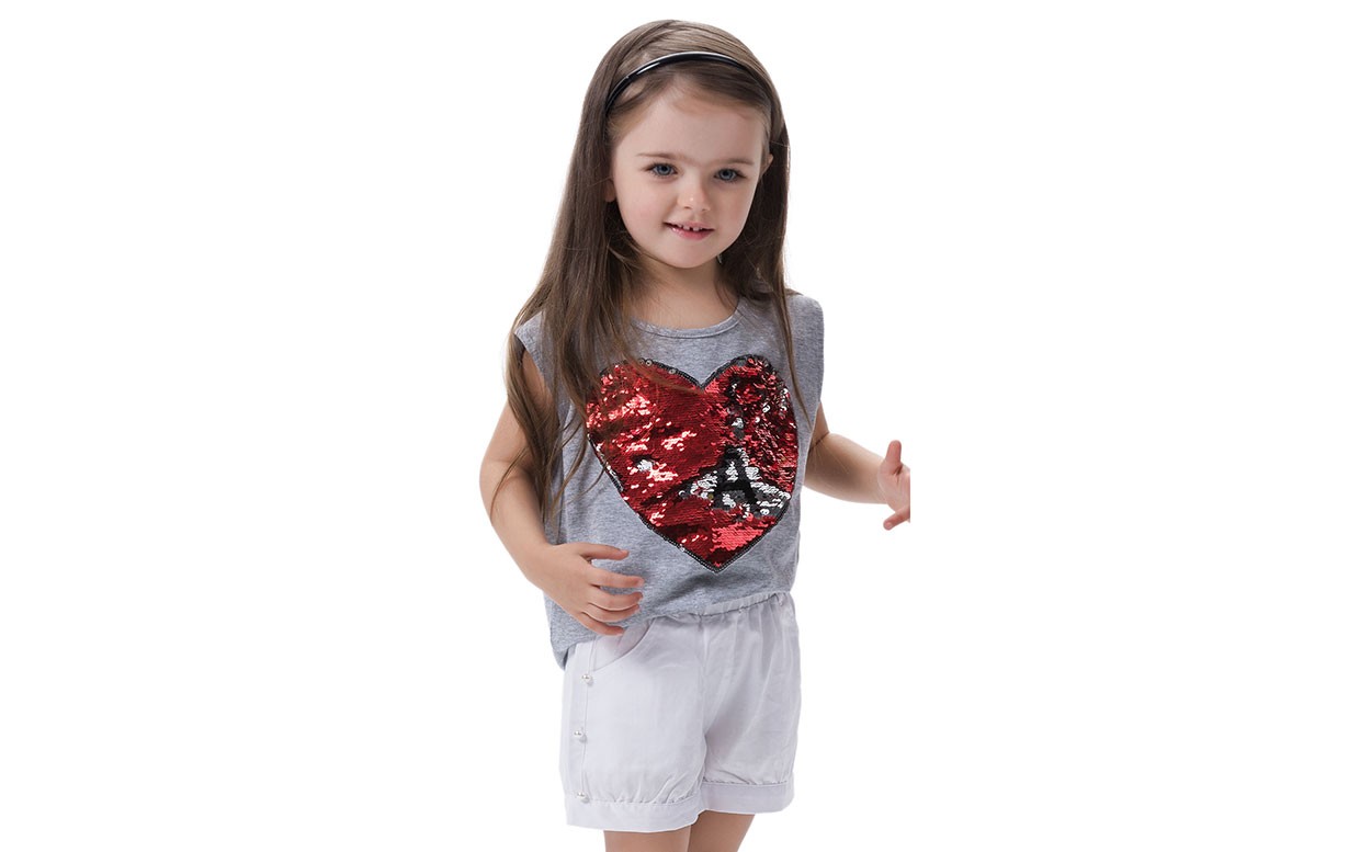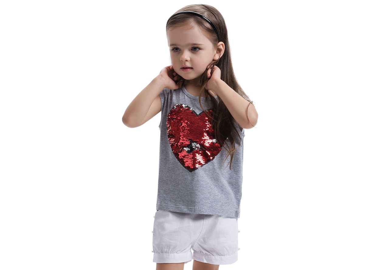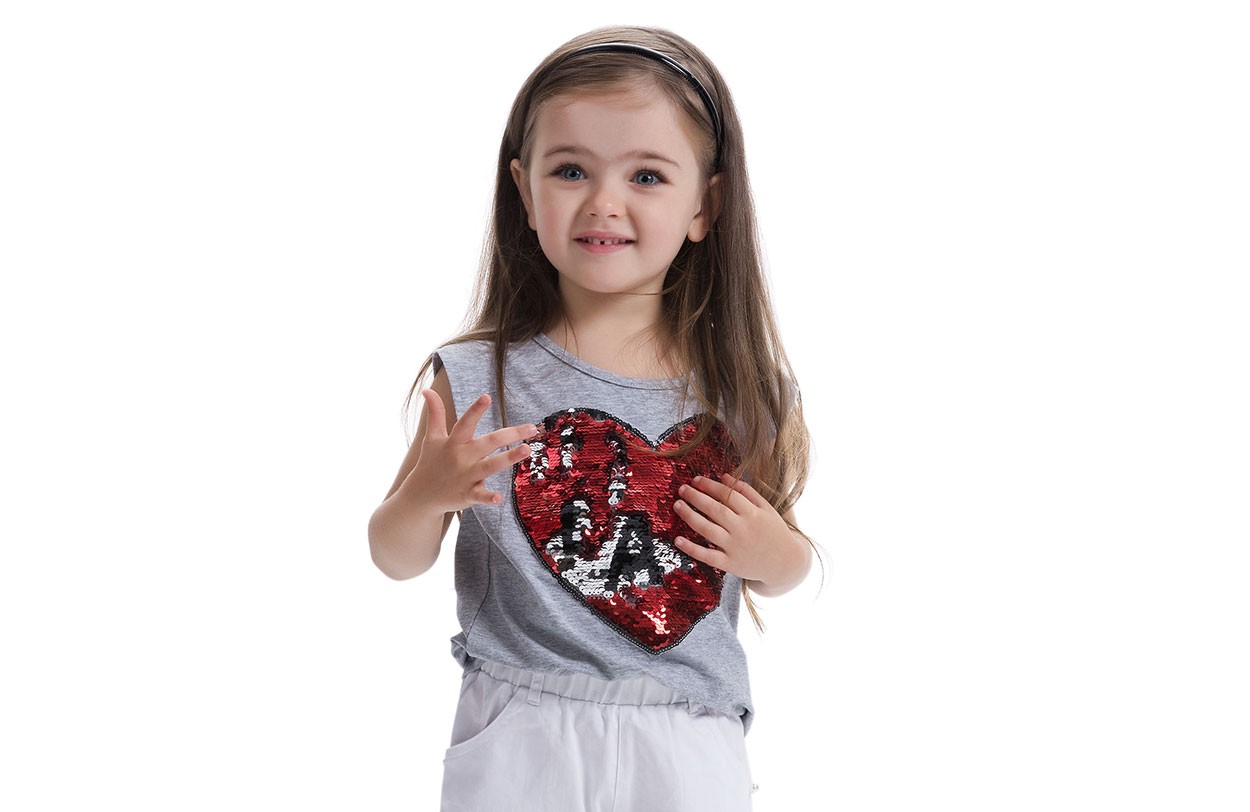 Bellissima maglietta per ragazze con cuore, completamente decorata con paillettes luccicanti.
