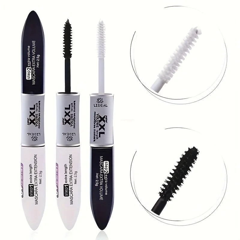 Mascara doppia con base bianca per allungamento e colore nero per uno sguardo intenso, volume delle ciglia, effetto duraturo senza grumi
