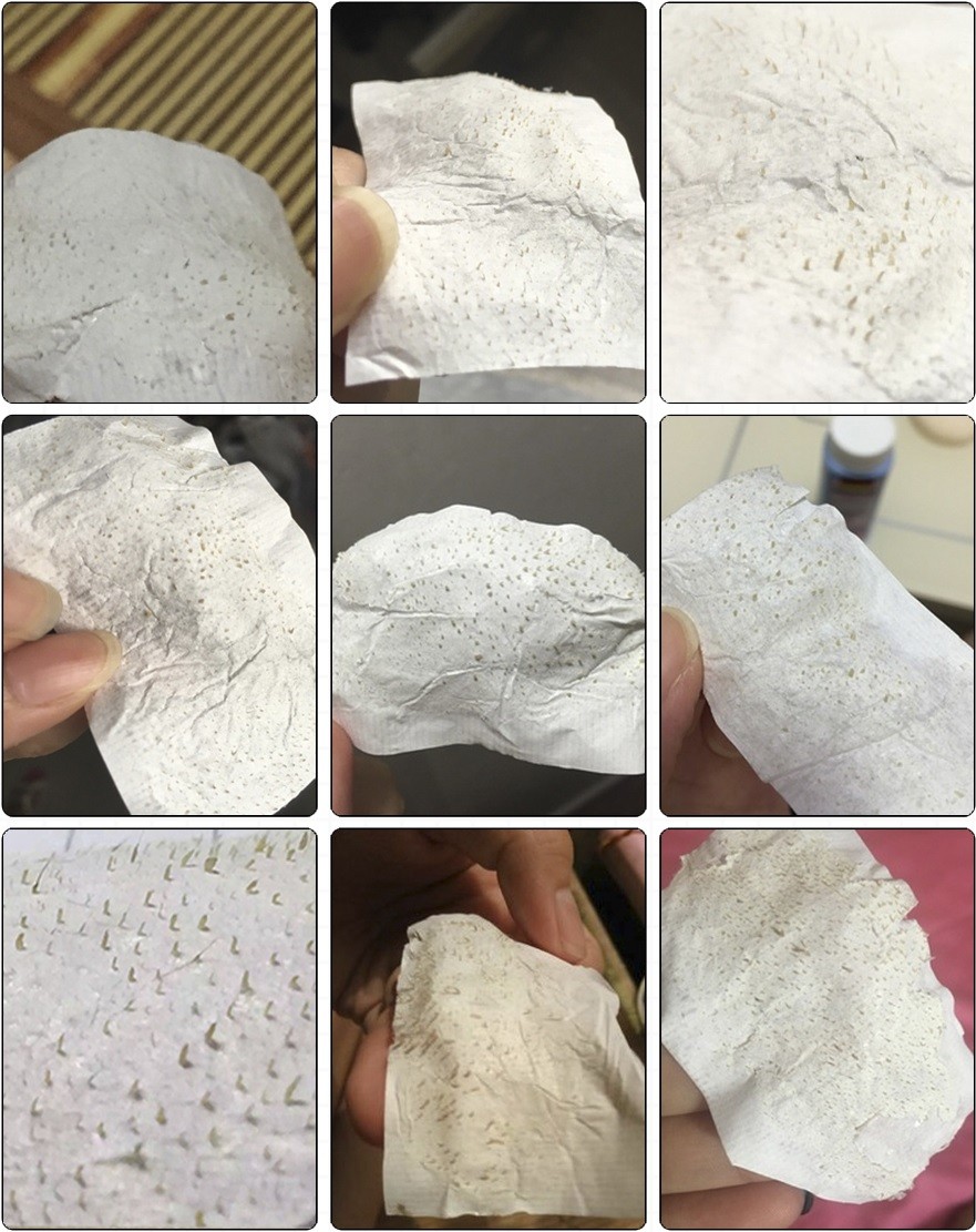 Applica uno strato sottile di maschera su pelle pulita e asciutta. Premi un foglietto sulla maschera applicata. Aspetta 15-20 min. e poi stacca.