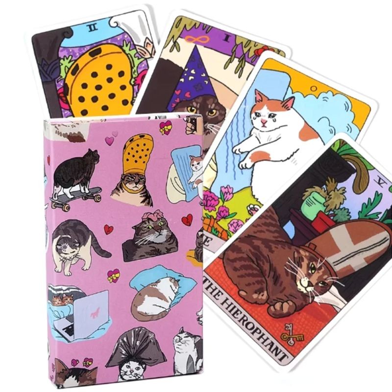 Questo mazzo di tarocchi con motivo di gatti offre un'interpretazione diversa delle carte tradizionali, basata su uno stile visivo giocoso. Le illustrazioni mostrano gatti in diverse situazioni e posizioni, che rimandano a simboli noti dei tarocchi. Grazie a ciò, le carte risultano chiare e mantengono il loro significato caratteristico.