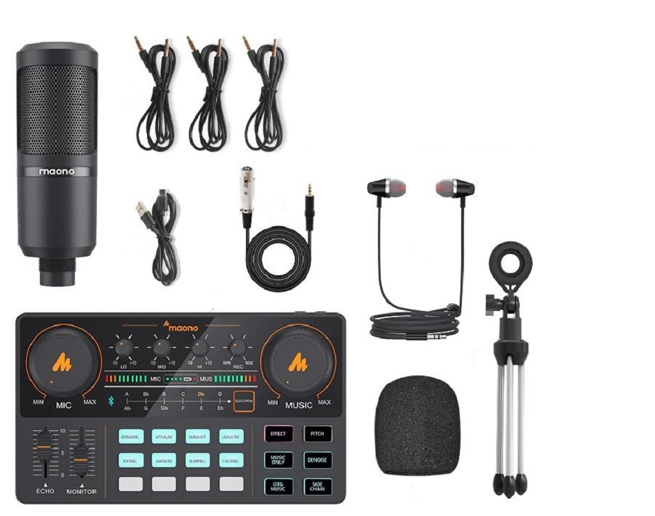 Contenuto della confezione: 1x microfono, 1x mixer, 3x cavo jack da 3,5 mm, 1x cavo XLR, 1x cuffie, 1x supporto, 1x cavo USB