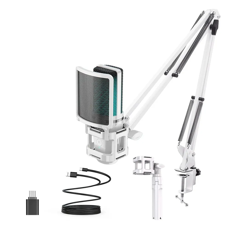 Set microfonico professionale con stativo stabile, filtro pop, connessione USB e retroilluminazione RGB ideale per streamer e registrazioni. Descrizione completa