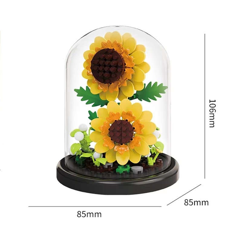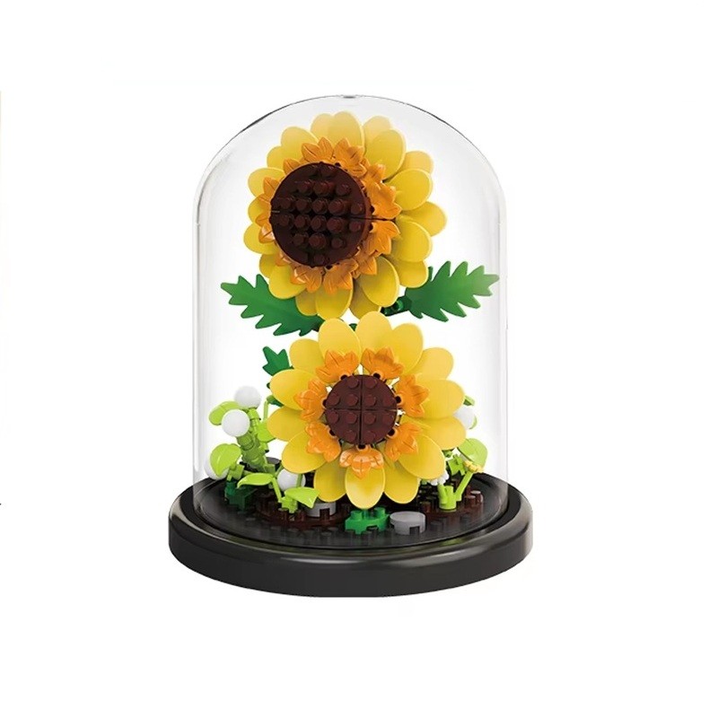Dettagliati girasoli in micro mattoncini in un elegante vaso e scatola trasparente sono una bella decorazione e un regalo creativo per bambini e adulti. Descrizione completa