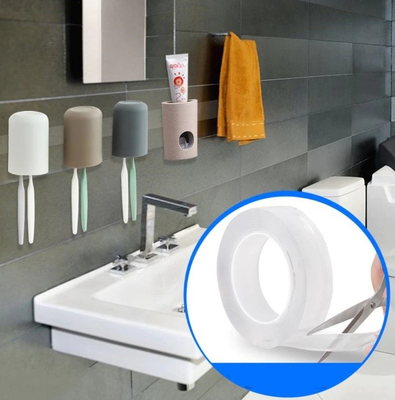 Nastro adesivo biadesivo trasparente. Il nastro è lavabile e riutilizzabile. Applicabile su qualsiasi superficie - muro, vetro, legno ecc. Un aiuto ideale se vuoi attaccare qualcosa facilmente, ma in modo sicuro e senza forare. Il nastro adesivo è inoltre impermeabile. Ha una larghezza di 20 mm.