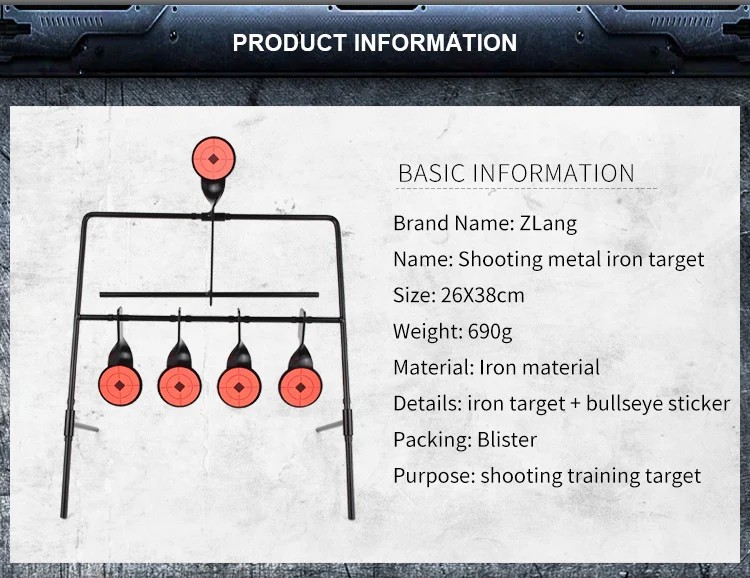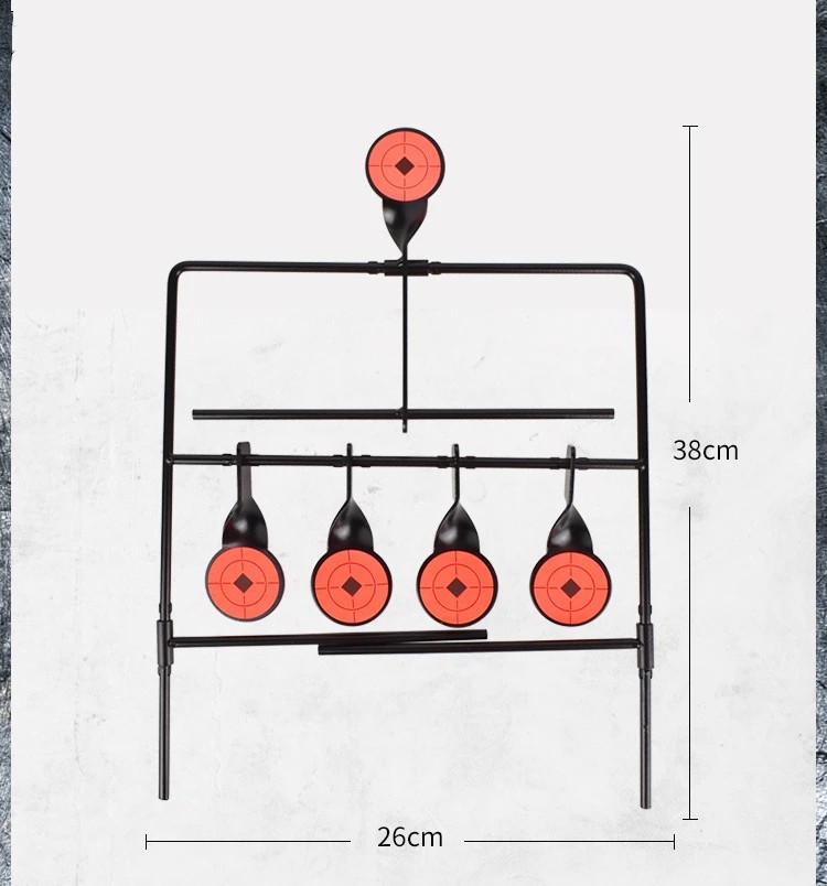 Obiettivo di tiro metallico rotante con cinque bersagli consente un allenamento continuo senza interruzioni. Il ripristino automatico della posizione dopo il colpo aumenta l'efficacia del tiro. Descrizione completa