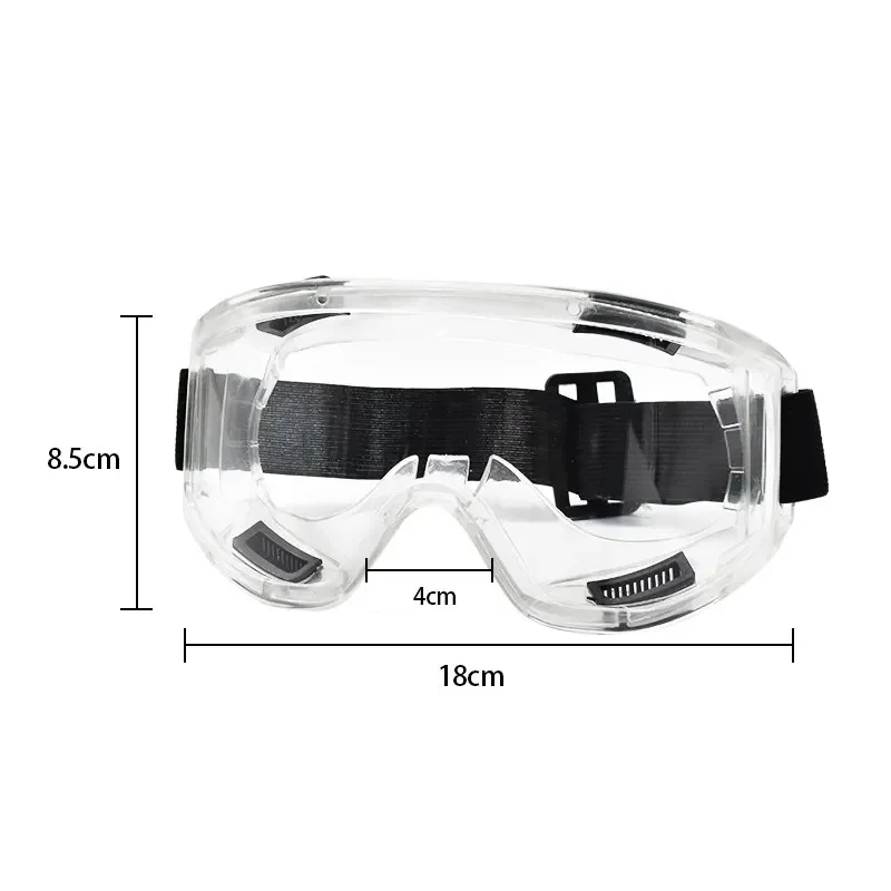 Occhiali protettivi da laboratorio con lenti in PC e telaio in PVC, resistenti al vento, a prova di polvere, con aperture di ventilazione e cinturino regolabile per il comfort. Descrizione completa