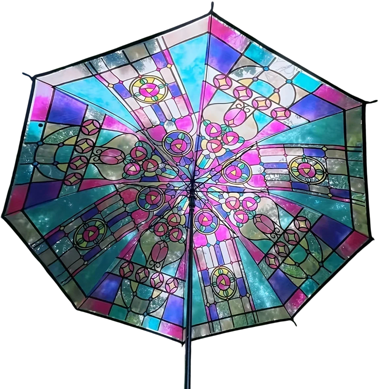 Accessorio elegante e originale per il tempo piovoso, che unisce praticità a un aspetto eccezionale. Questo ombrello colpisce per il suo design vetrato unico ispirato al vetro colorato, che lo rende molto stiloso e insolito. È ideale per l'uso quotidiano in città, per andare al lavoro e per occasioni festive. Grazie all'apertura manuale, hai il pieno controllo sul suo utilizzo.