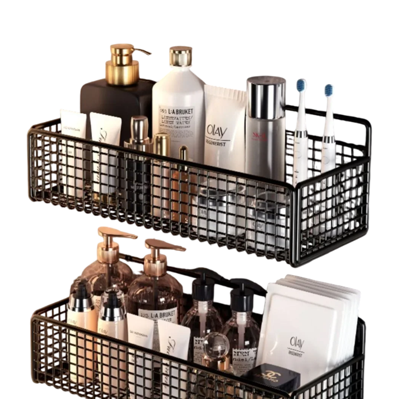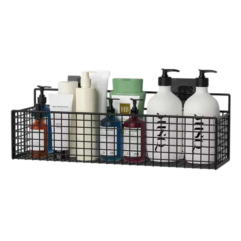 Pratico organizzatore da bagno da parete senza foratura per riporre articoli da toeletta, shampoo, gel doccia e altri accessori. Descrizione completa