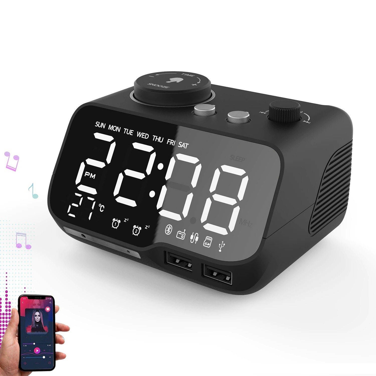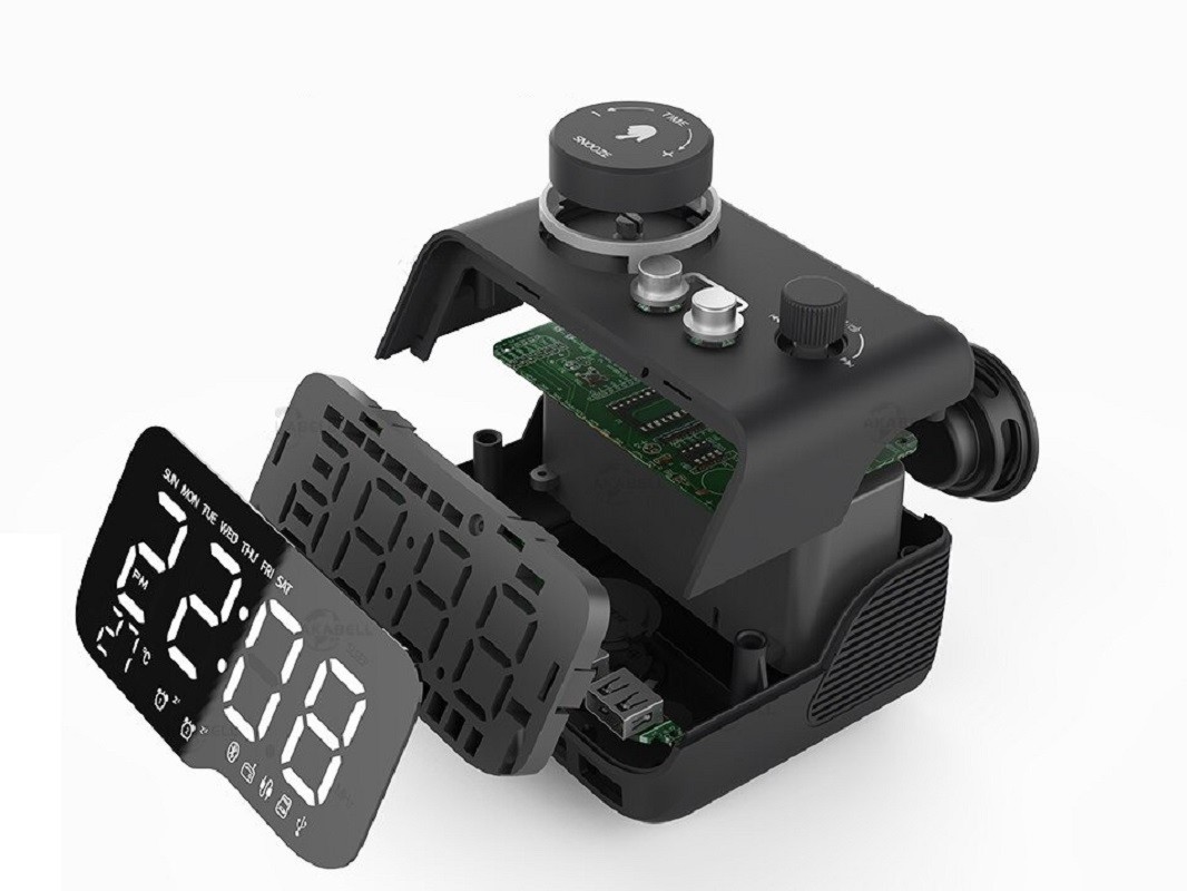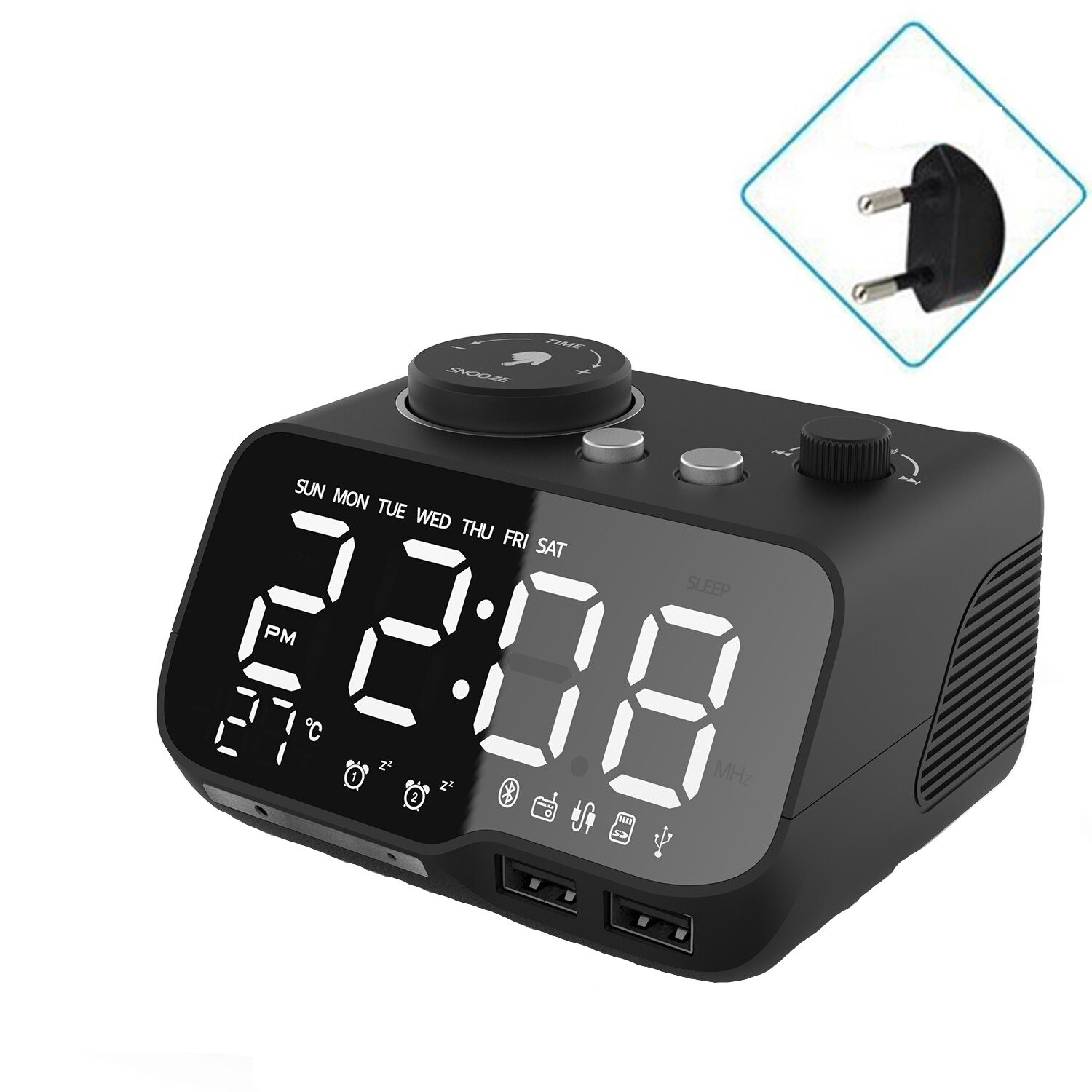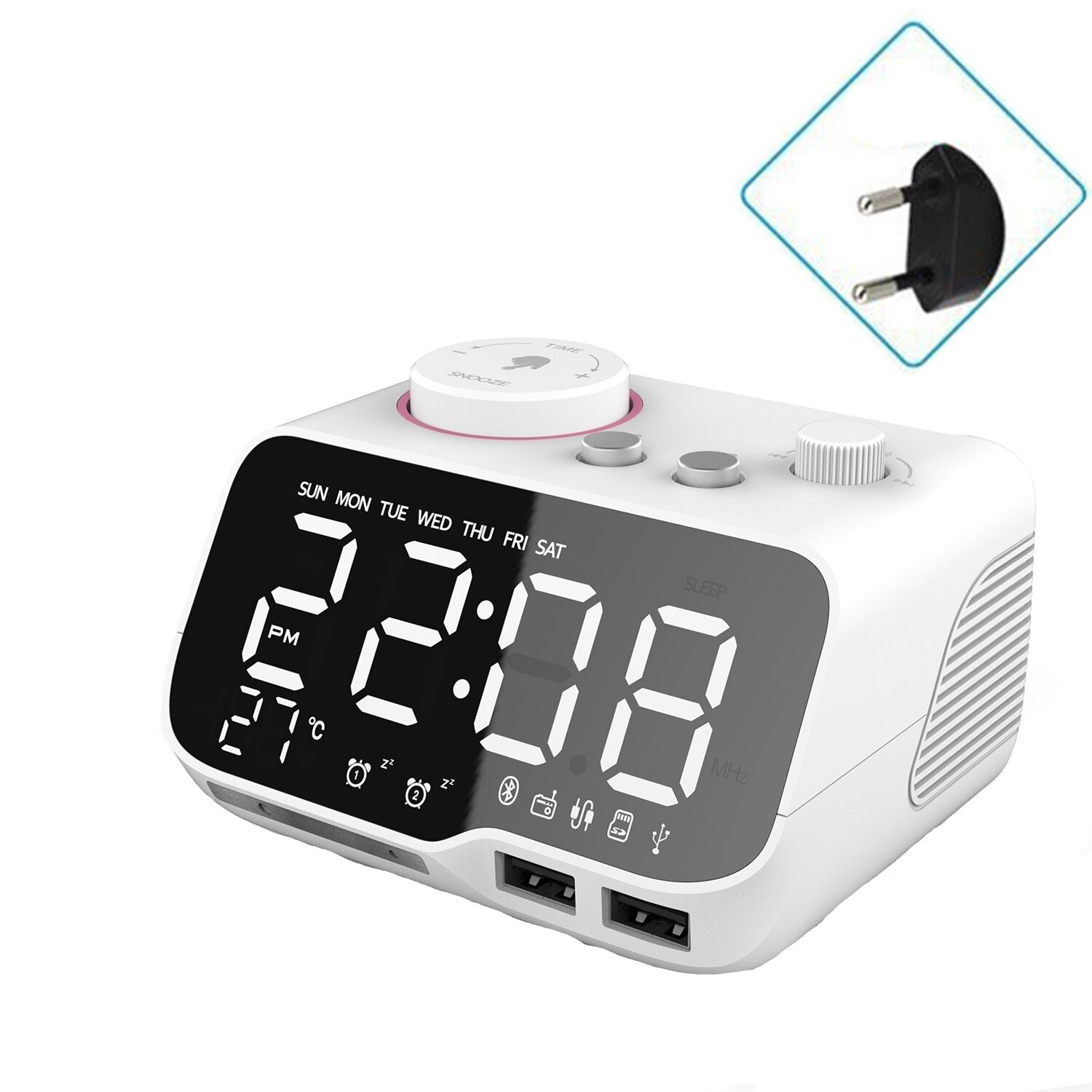 Funzioni: altoparlante bluetooth, radio FM, 2x ingresso USB, porta da 3,5 mm, termometro, data, sveglia