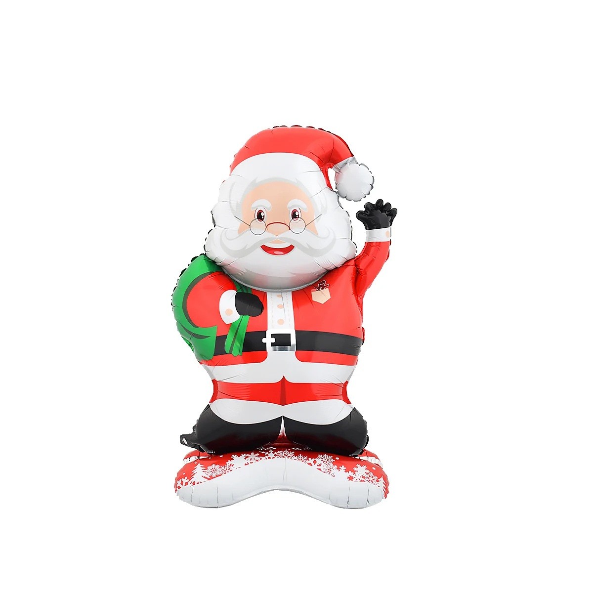 Il palloncino è progettato a forma di Santa Claus con il tipico cappello rosso, la barba bianca e l'abbigliamento festivo. La figura è rappresentata in un gesto amichevole con la mano alzata e un regalo. Questi elementi creano un aspetto caratteristico, che è associato alla tematica natalizia.