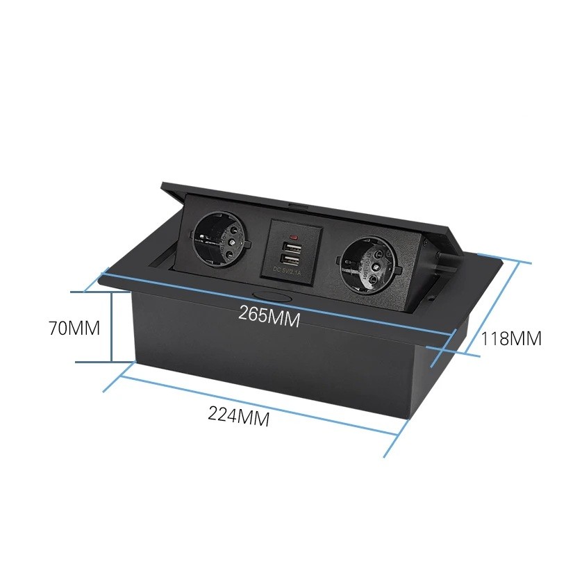 Il pannello contiene 2 prese EU e porte USB, ampliando le possibilità di connessione. Dimensioni 265 × 118 × 70 mm consentono l'installazione in superfici di lavoro standard. Foro di montaggio 230 × 110 mm garantisce un'installazione precisa. Pannello in alluminio contribuisce alla robustezza della struttura. Pulsante per l'estrazione consente un facile utilizzo.