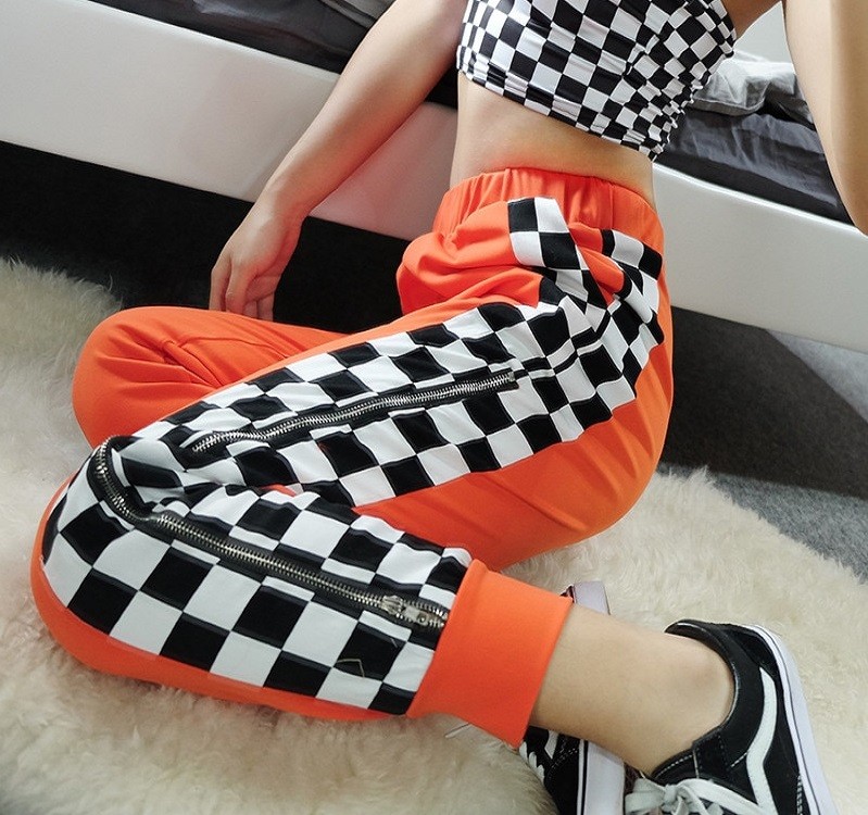 Pantaloni da donna arancioni a quadri con zip