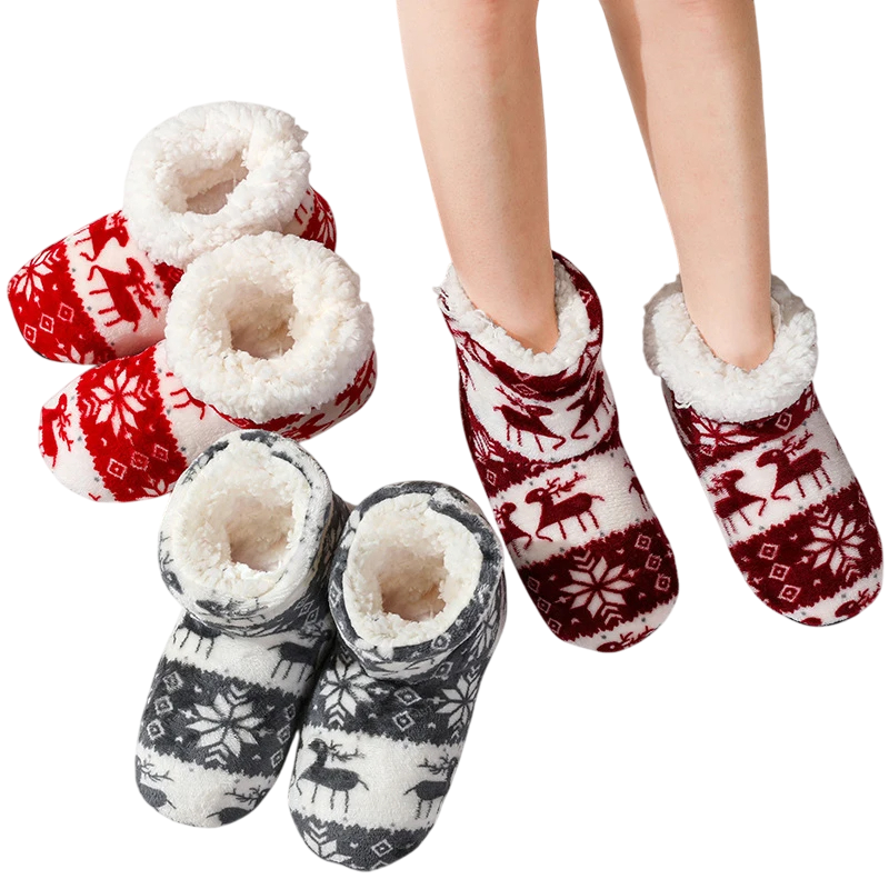 Pantofole da donna morbide e calde con taglio alto, pelliccia interna e vivace motivo invernale. Calzature ideali per le serate fredde a casa. Descrizione completa