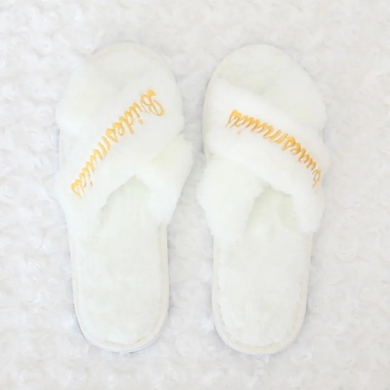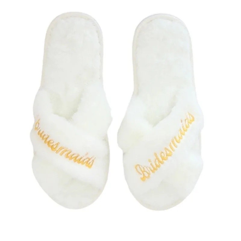 Pantofole bianche e chlupate con la scritta Bridesmaid. Accessorio stiloso per la družička all'addio al nubilato. Descrizione completa