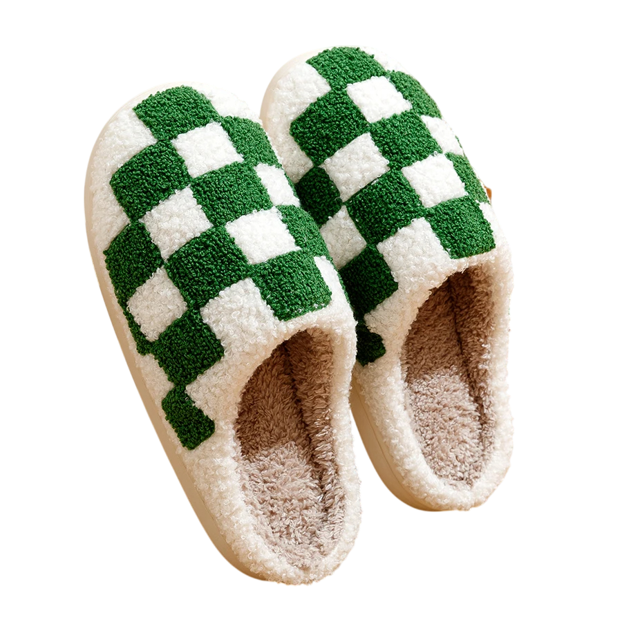 Pantofole domestiche calde con interno peloso e motivo a quadri retro. Comode, stilose e ideali per le serate fredde a casa. Descrizione completa