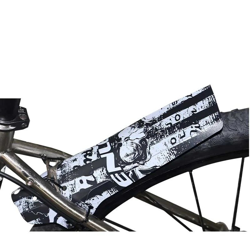 Il design del para fango è caratterizzato da un evidente design bianco e nero con un dominante motivo teschio, strisce e grafica usurata. Il motivo appare robusto, industriale e sportivo, il che sarà apprezzato soprattutto dai ciclisti che desiderano dare alla propria bicicletta un carattere distintivo e differenziarsi dagli accessori monocolore comuni. Il motivo è contrastante e ben visibile.