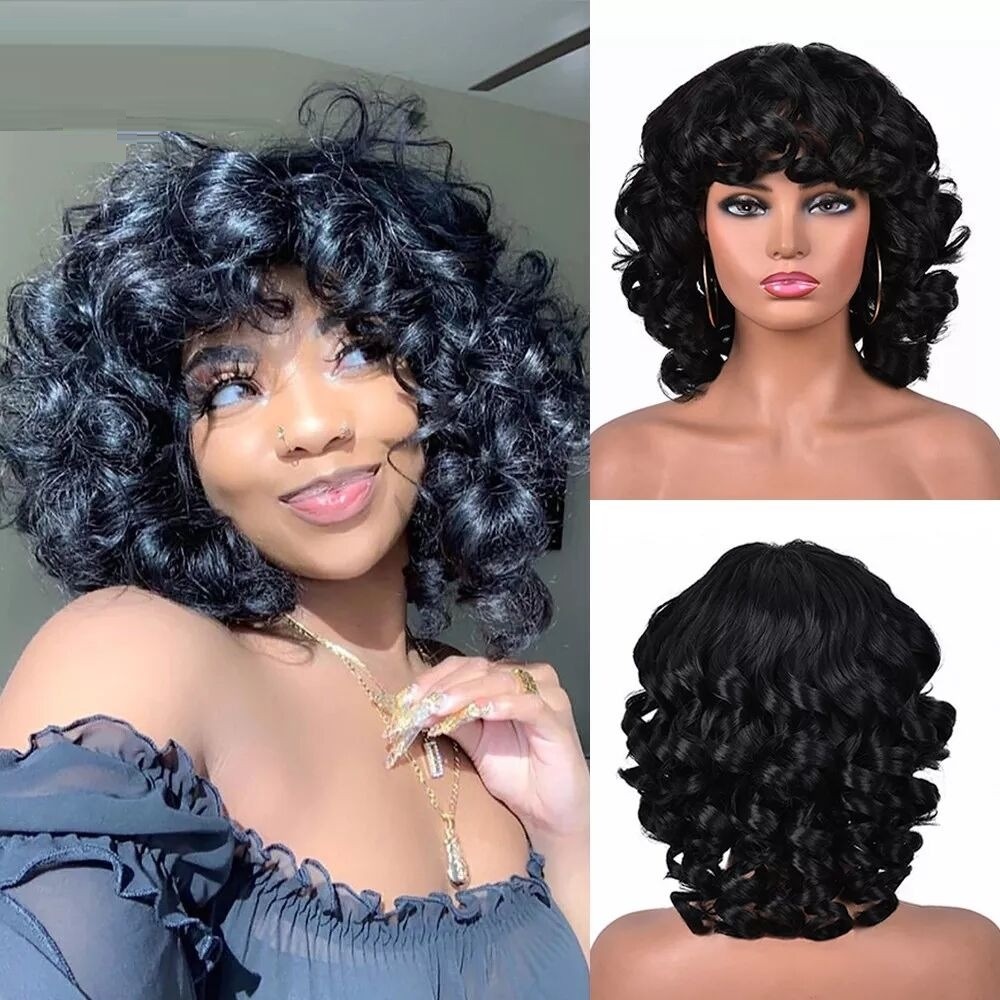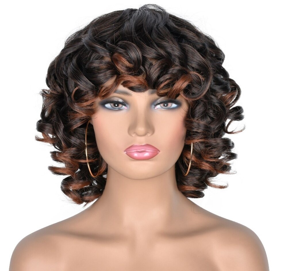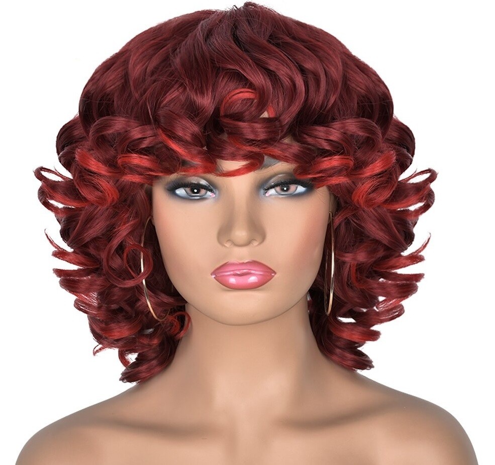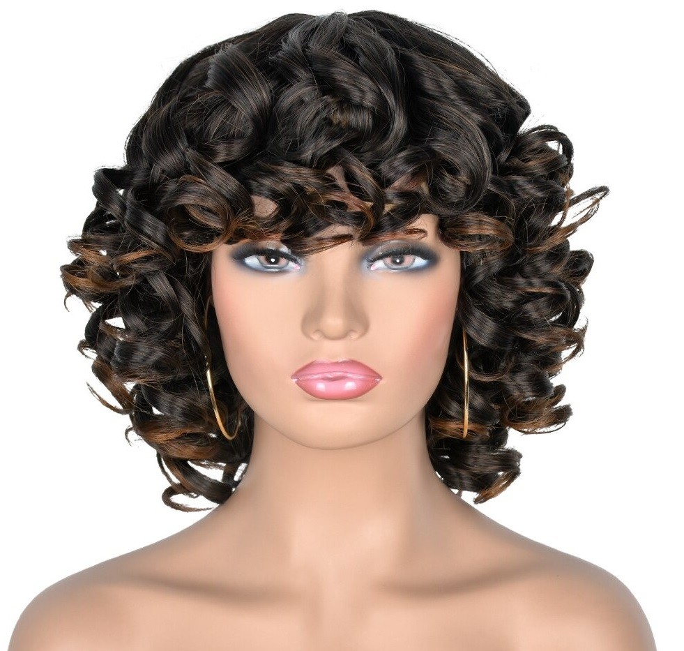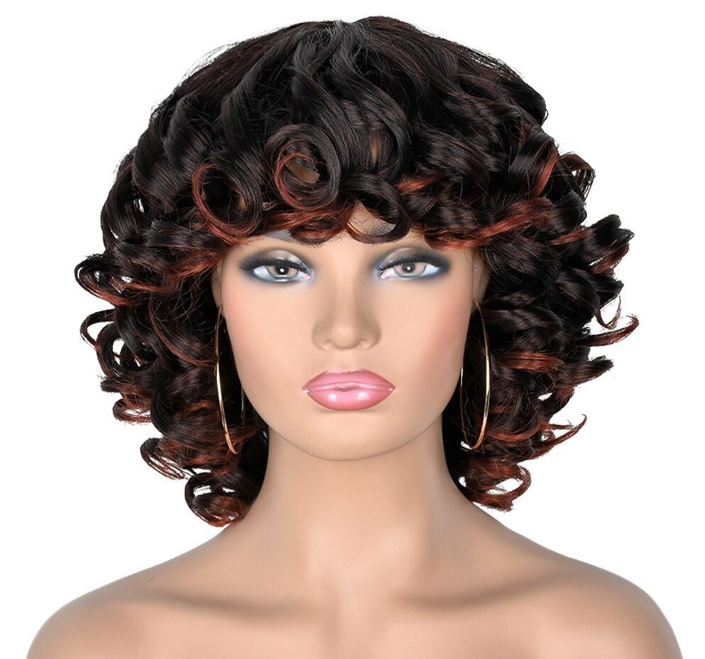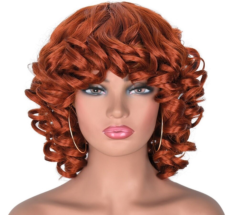 Parrucca corta ondulata da donna con frangia. Resistente ai danni. Confortevole da indossare. Grazie all'aspetto naturale, puoi indossarla ovunque. Può essere lavata con shampoo e laccata. Realizzata con fibre sintetiche di alta qualità.