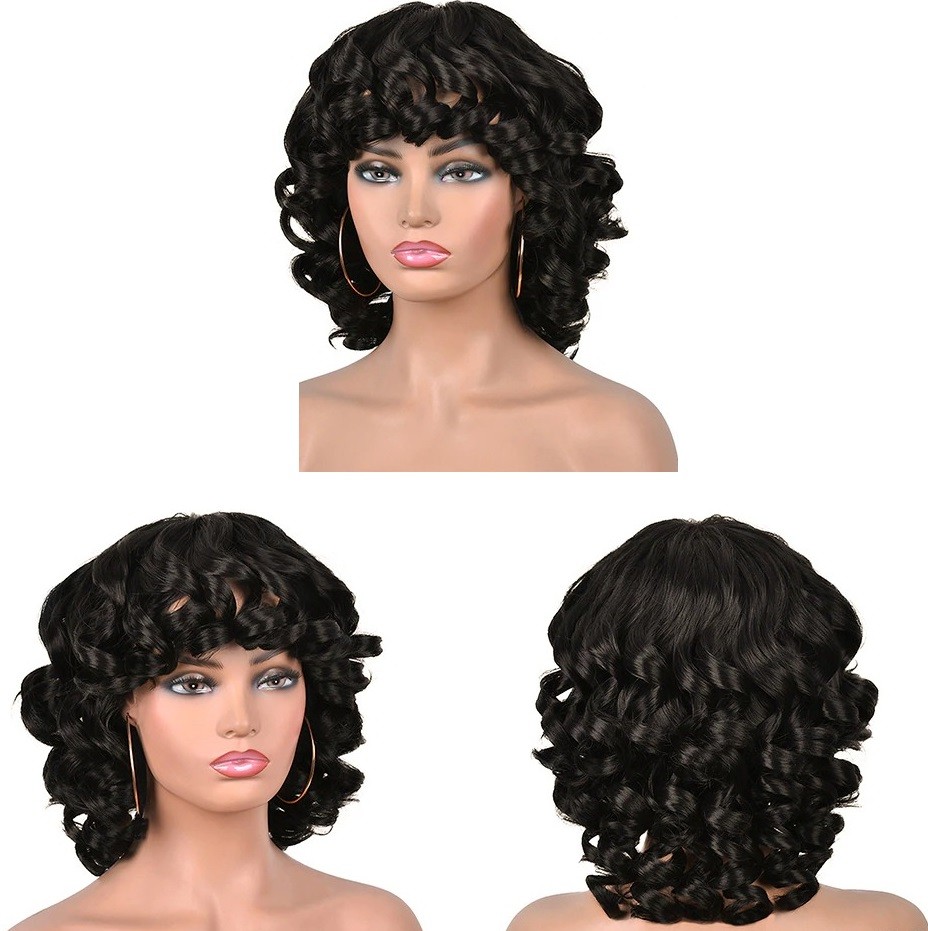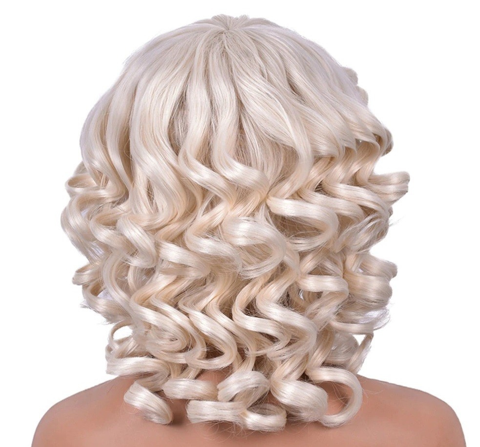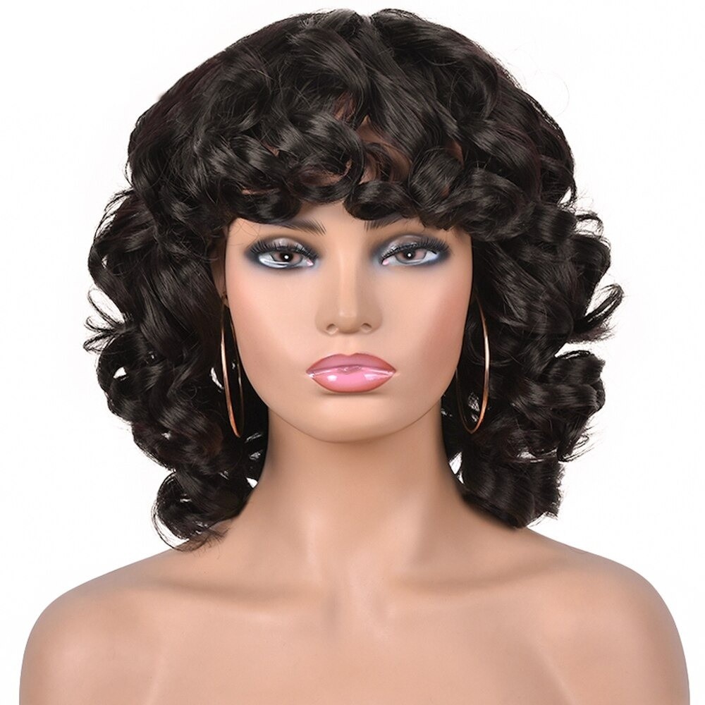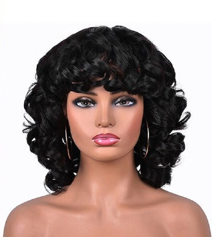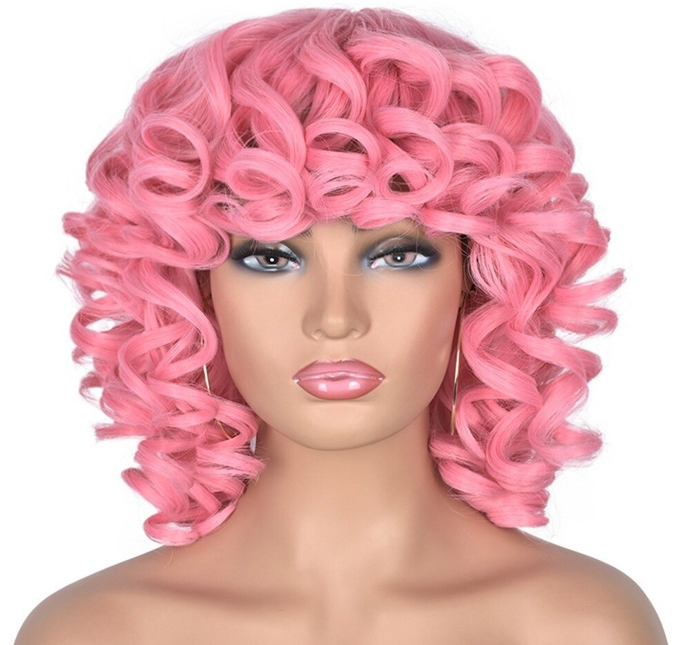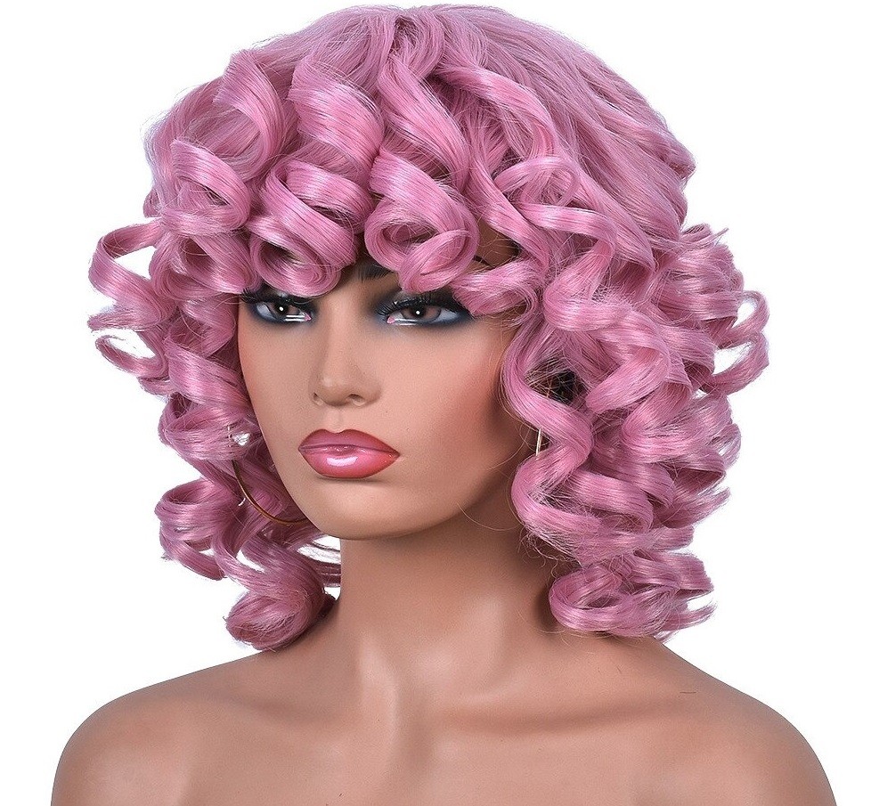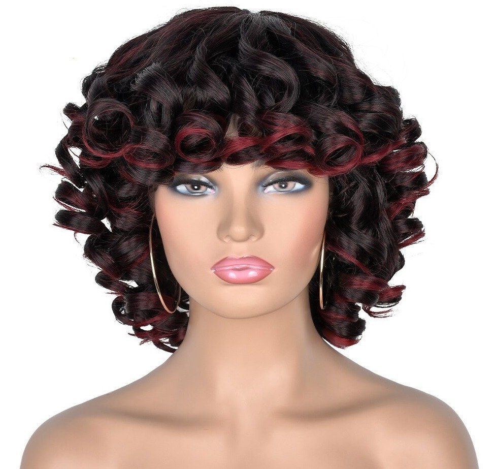 Parrucca corta ondulata da donna con frangia. Resistente ai danni. Confortevole da indossare. Grazie all'aspetto naturale, puoi indossarla ovunque. Può essere lavata con shampoo e laccata. Realizzata con fibre sintetiche di alta qualità.