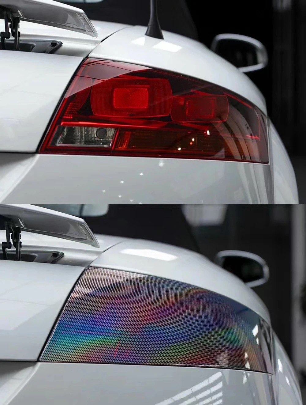 Grande pellicola protettiva per fari e fanali posteriori con effetto arcobaleno. Stile, protezione e facile montaggio senza attrezzi. Descrizione completa