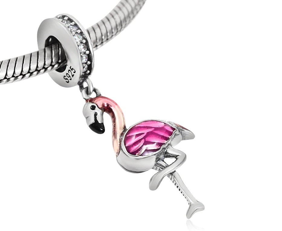 Questo pendente da donna in argento a forma di fenicottero è adatto sia per collane che per bracciali Pandora.