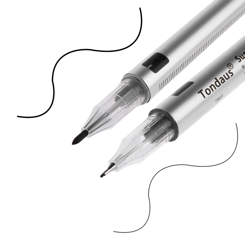 La penna ha due mine, una molto sottile per il contorno e l'altra più larga per il riempimento.