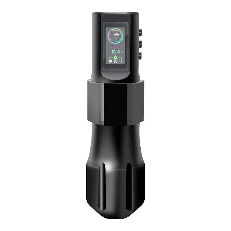 Il display LCD fornisce una panoramica immediata della tensione impostata e dello stato della batteria, il che significa che hai tutto sotto controllo anche durante sessioni di lavoro prolungate. Il funzionamento wireless garantisce la massima libertà di movimento, mentre la ricarica USB-C consente una ricarica rapida e comoda. Grazie al funzionamento silenzioso del motore, lavorare con questa penna per tatuaggi è confortevole sia per l'artista che per il cliente.