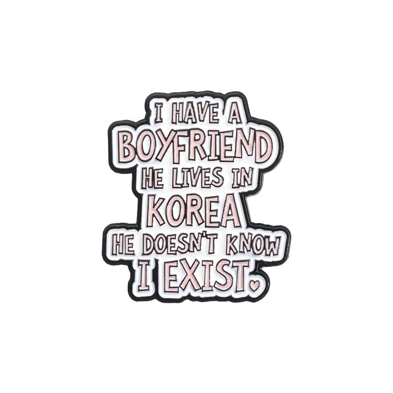 Pin smaltato K-pop con la scritta I HAVE A BOYFRIEND IN KOREA 2,7 × 3 cm spilla in metallo bianco rosa distintivo per zaino giacca abbigliamento