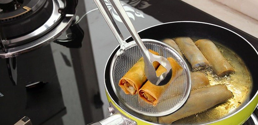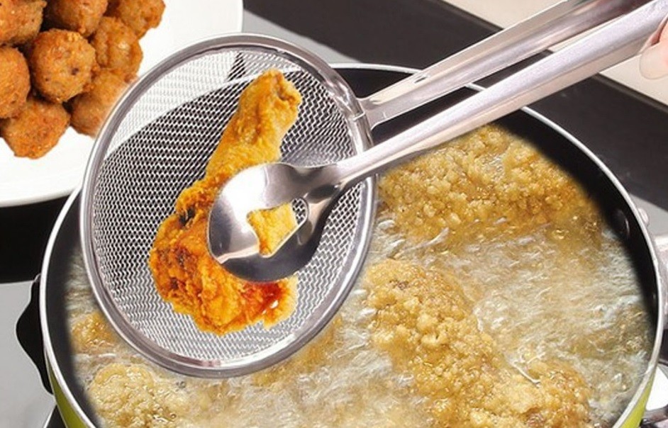 Acquistate queste pinze in acciaio inossidabile. Con le pinze potete facilmente afferrare il cibo fritto e farlo sgocciolare sopra la padella attraverso il setaccio.