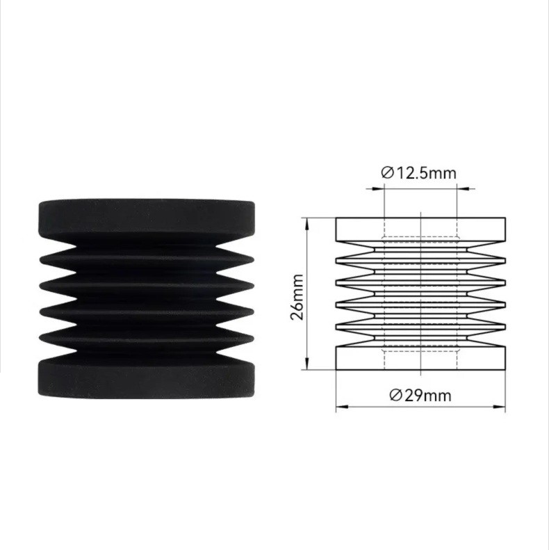 Ogni podložka è progettata con una struttura scanalata che aumenta la capacità di assorbire le vibrazioni e massimizza il contatto con il suolo. Il diametro della parte superiore è di 29 mm, la parte inferiore è anch'essa di 29 mm e l'altezza è di 26 mm, offrendo una combinazione ideale di stabilità e flessibilità. Al centro si trova un foro di 12 mm di diametro, che consente il posizionamento sui piedini originali della stampante. Il materiale utilizzato è resistente a carichi prolungati e non indurisce, mantenendo l'efficacia delle podložki anche dopo molte ore di utilizzo.