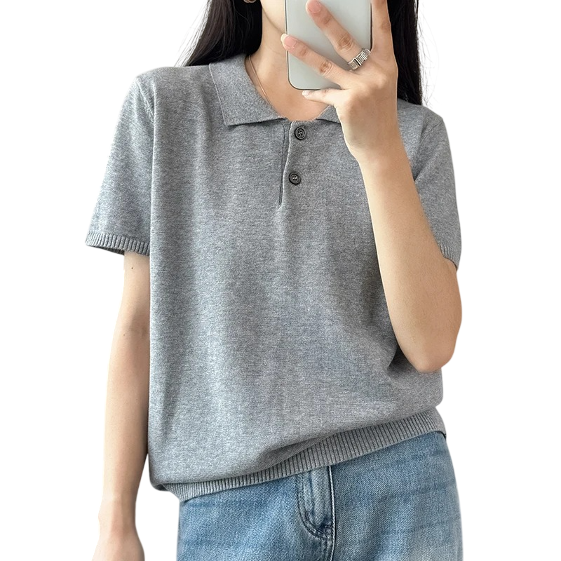Polo donna a maniche corte in tinta unita Collo a V con colletto e bottoni Top in cotone