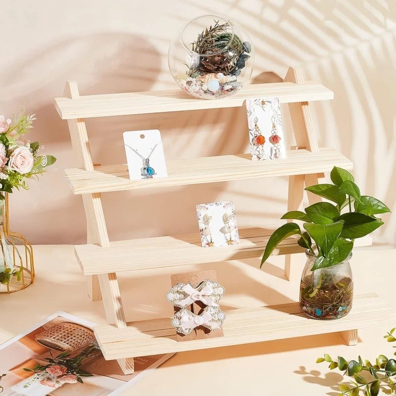 Il supporto consente di esporre gioielli, schede o piccole decorazioni in modo ordinato su più livelli. Grazie alla struttura a gradini, i singoli oggetti sono ben visibili.