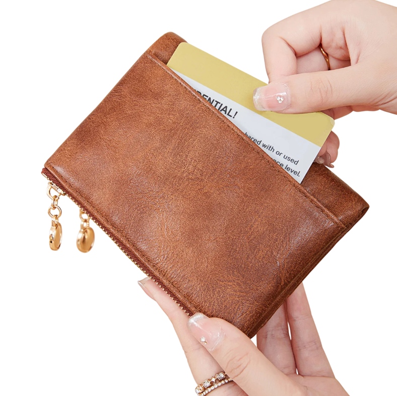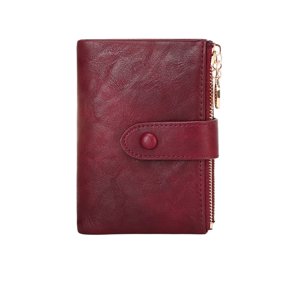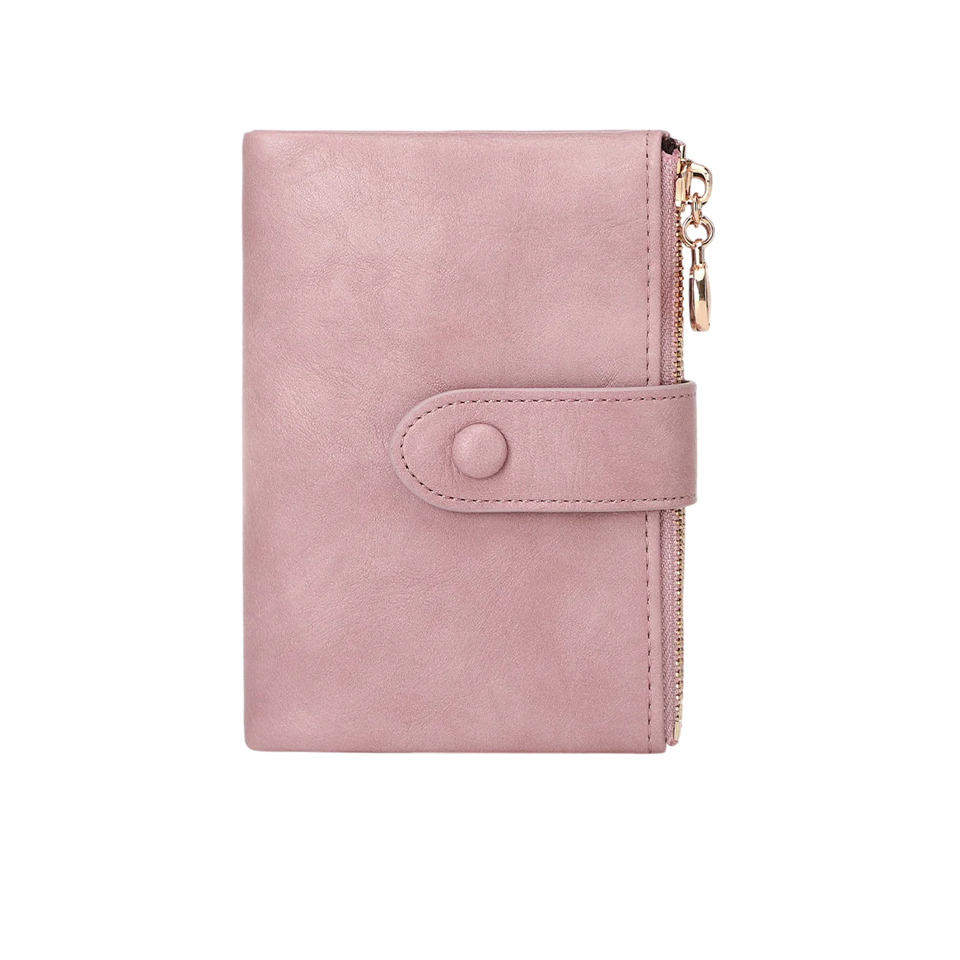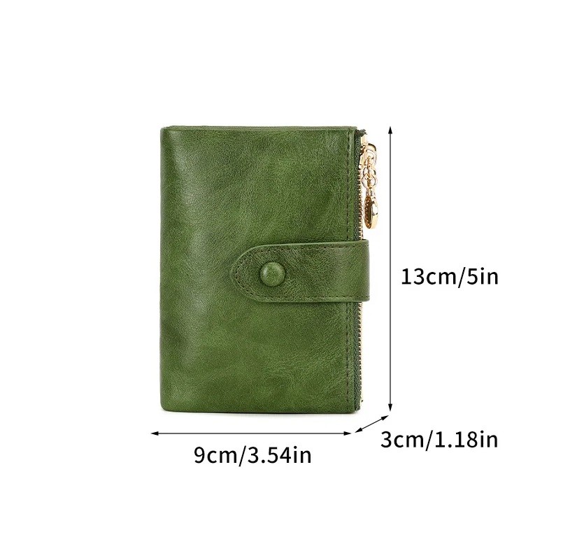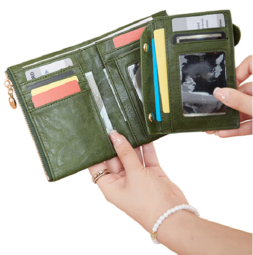 Elegante portafoglio da donna con struttura pieghevole offre un'organizzazione chiara di carte e documenti e dimensioni pratiche per l'uso quotidiano. Descrizione completa