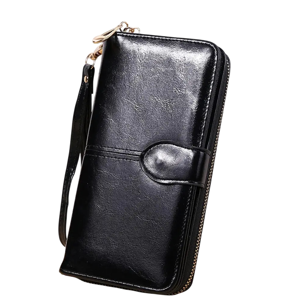 Pratico portafoglio da donna con disposizione pieghevole, chiusura a zip e grande capacità, dotato di manico per un trasporto comodo. Descrizione completa